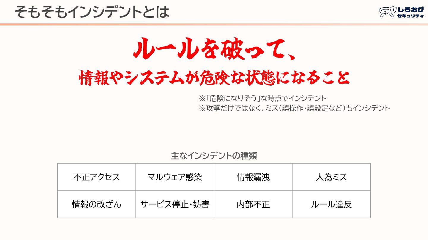 そもそもインシデントとは 不正アクセス マルウェア感染 情報漏洩 人為ミス 情報の改ざん サービス停止・妨害 内部不正 ルール違反 主なインシデントの種類