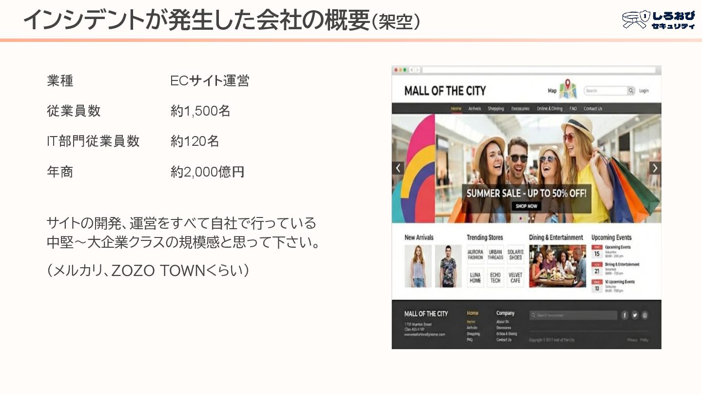 インシデントが発生した会社の概要(架空) サイトの開発、運営をすべて自社で行っている 中堅~大企業クラスの規模感と思って下さい。 (メルカリ、ZOZO TOWNくらい) 業種 ECサイト運営 従業員数 約1,500名 IT部門従業員数