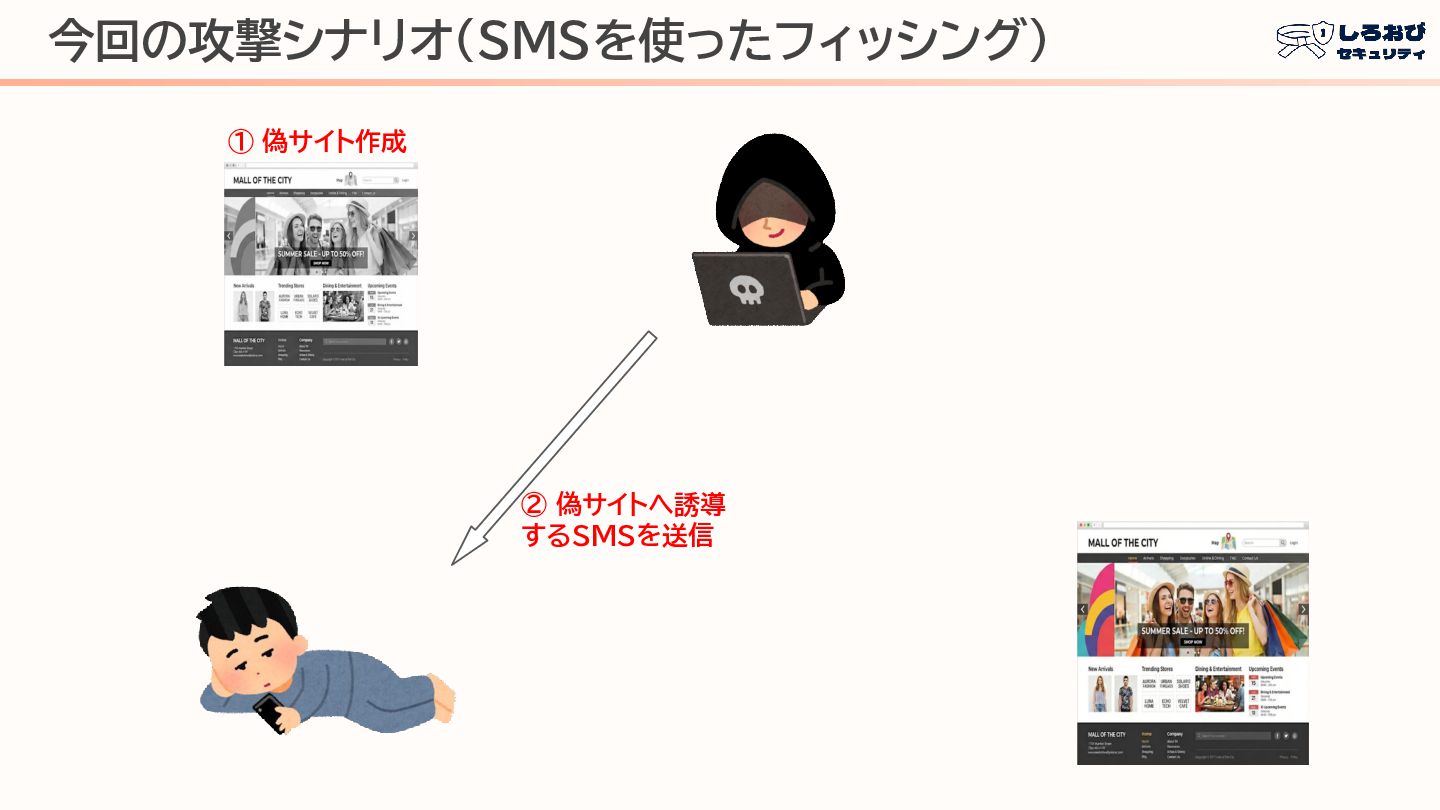 今回の攻撃シナリオ(SMSを使ったフィッシング) ① 偽サイト作成 ② 偽サイトへ誘導 するSMSを送信