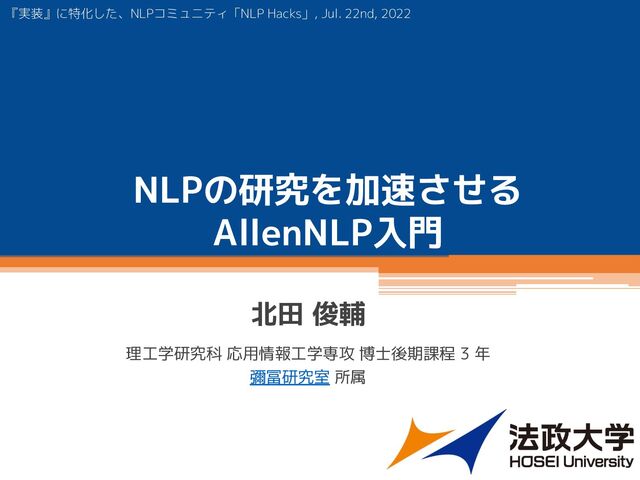 Training the model with your own script • allennlp trainによるモデルの学習 Training the model with your own script • モデルの評価 Evaluating the model • ラベルのない入力に対する予測 Making predictions for unlabeled data テキスト分類モデルを学習し、新しい入力に対して予測させる2通りの方法を説明します • 自分でスクリプトを書いてDatasetReaderとModelを構築し、学習ループを実行する方法 • 設定ファイルを書いて allennlp train コマンドを使う方法 AllenNLP は allennlp train コマンドを使うことでさらに強力な実験PDCAサイクルを実現します! スクリプトを書くなら pytorch lightning とかでもいいのでは?とも思います😂 AllenNLP について > ことはじめ > 学習・予測 > API 化 > Registrable 機構 > オレオレ Subcommand