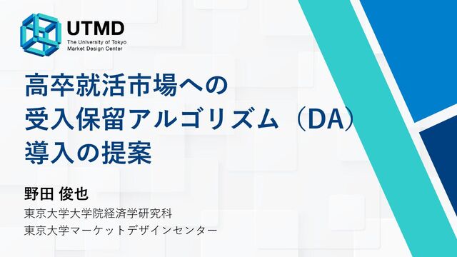 東京大学マーケットデザインセンター(UTMD)では、現在、学校斡旋に基づいて高校生が就活する際に用いられている、「1人1社制」(就活開始当初のある程度長い期間、各生徒はそれぞれ1社にしか応募することを許されないという制度)から、DAアルゴリズムを用いた複数応募制への切り替えを提案しています。