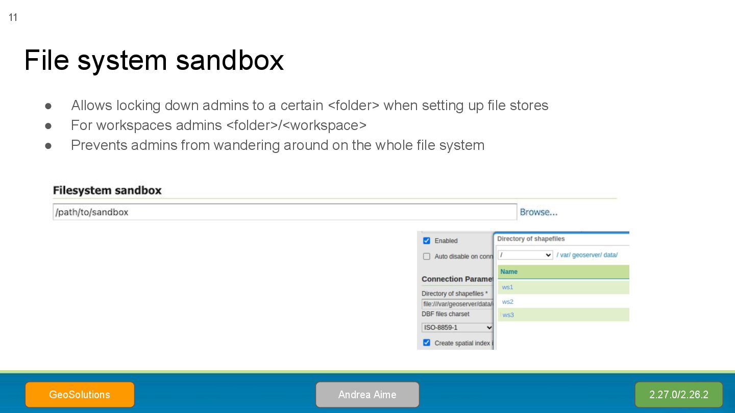 setting up file stores • For workspaces admins <folder>/<workspace> • Prevents admins from wandering around on the whole file system File system sandbox Andrea Aime GeoSolutions 2.27.0/2.26.2 11