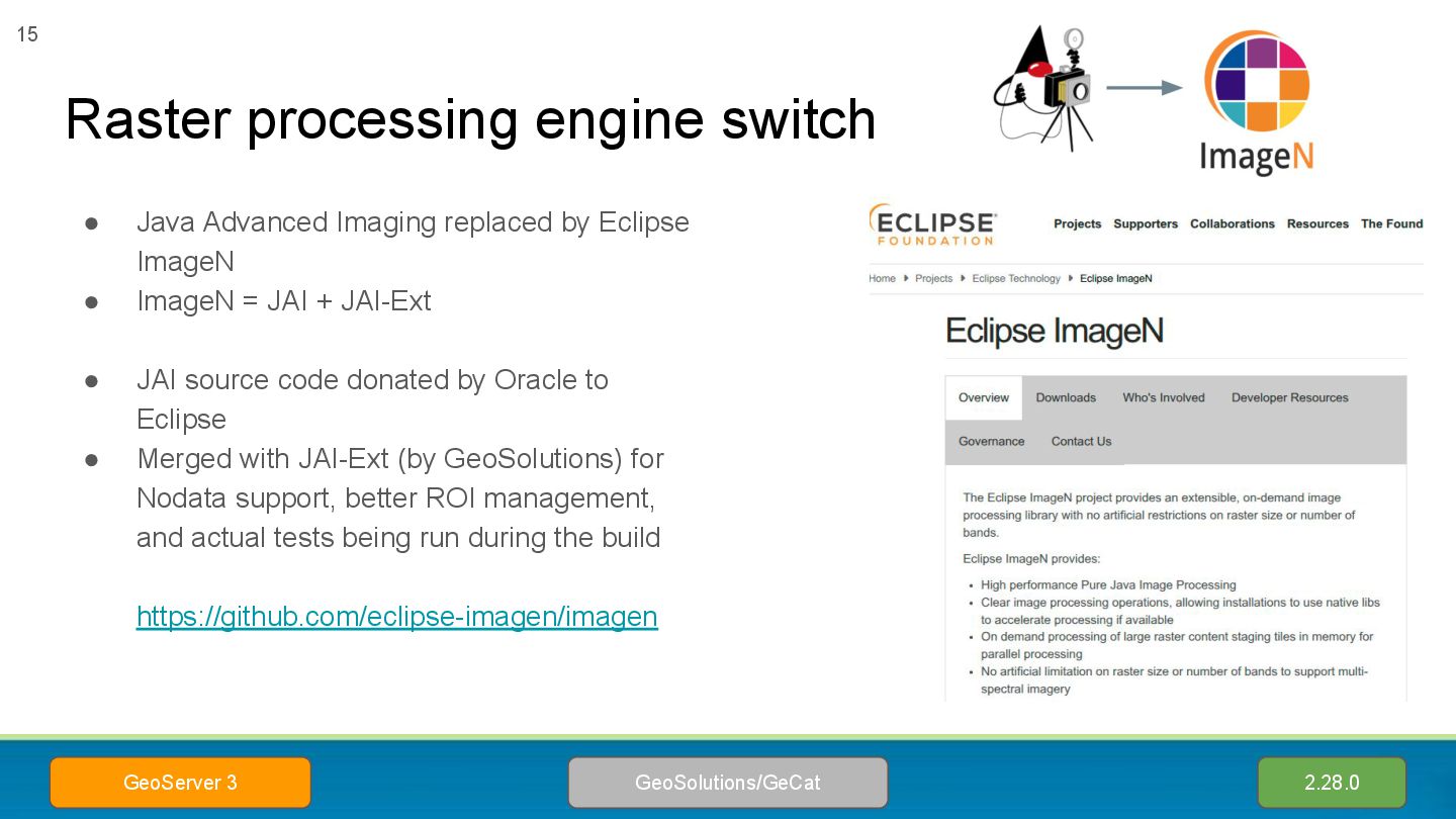 Java Advanced Imaging replaced by Eclipse ImageN • ImageN = JAI + JAI-Ext • JAI source code donated by Oracle to Eclipse • Merged with JAI-Ext (by GeoSolutions) for Nodata support, better ROI management, and actual tests being run during the build https://github.com/eclipse-imagen/imagen