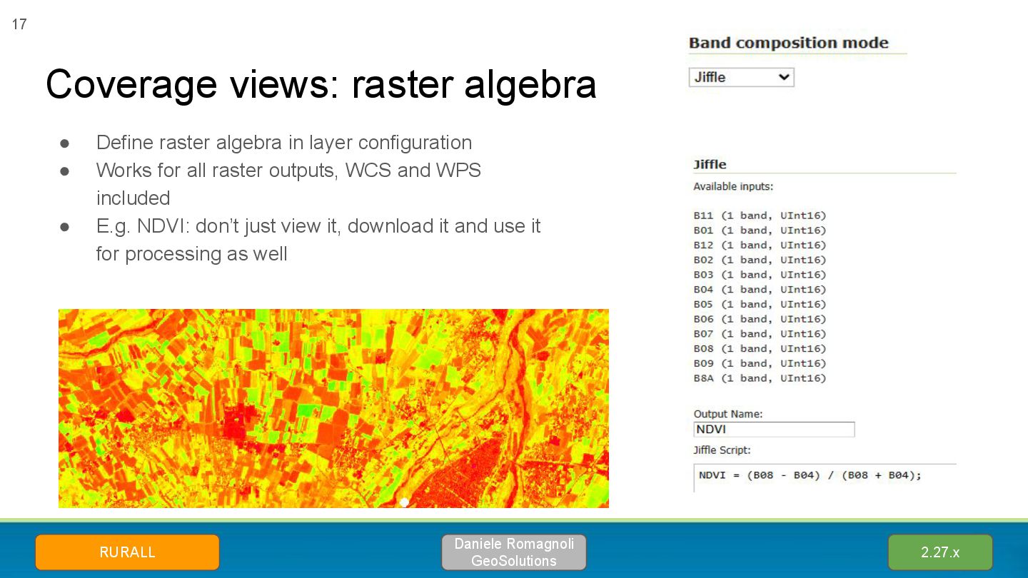 configuration • Works for all raster outputs, WCS and WPS included • E.g. NDVI: don’t just view it, download it and use it for processing as well 2.27.x Daniele Romagnoli GeoSolutions RURALL 17