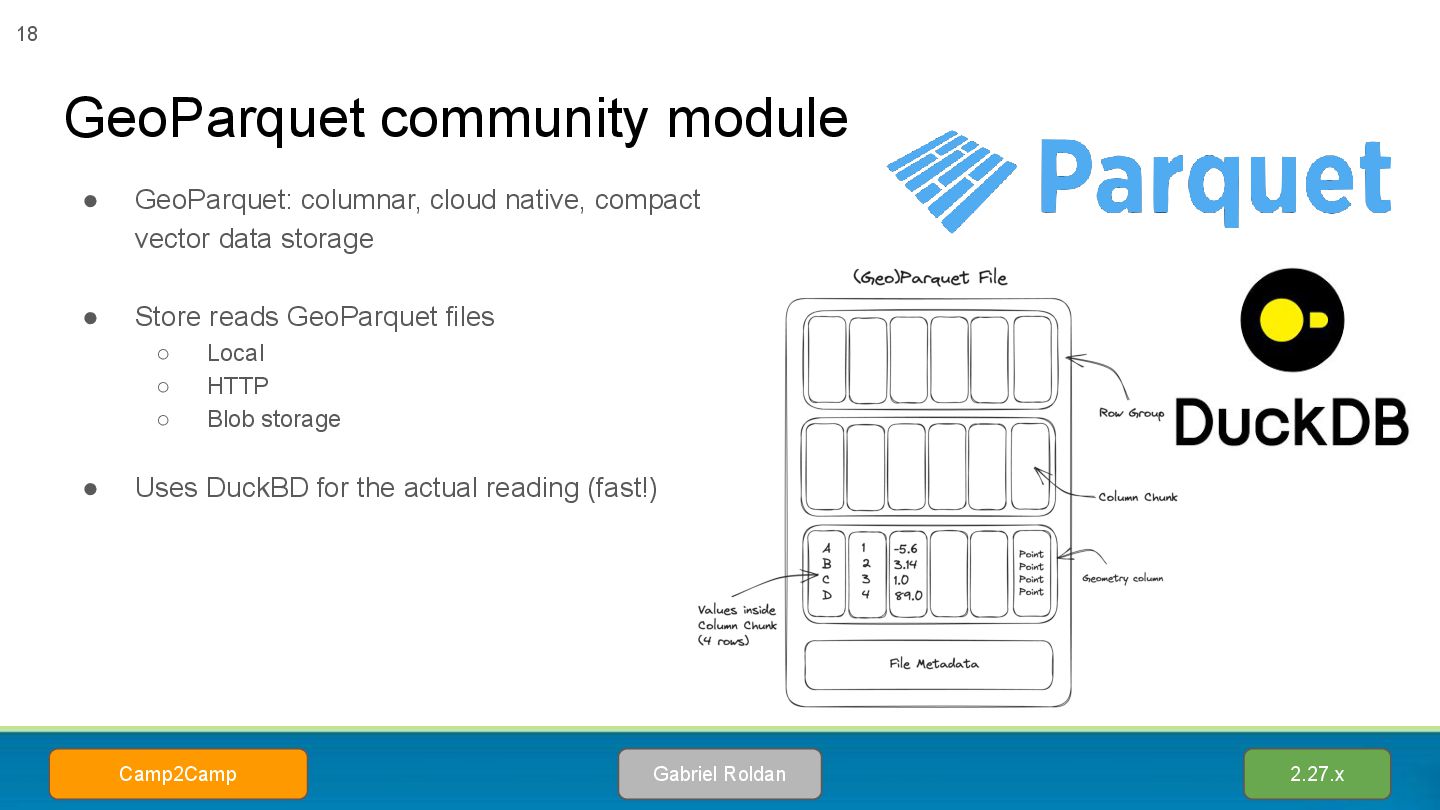 data storage • Store reads GeoParquet files ◦ Local ◦ HTTP ◦ Blob storage • Uses DuckBD for the actual reading (fast!) 2.27.x Gabriel Roldan Camp2Camp 18