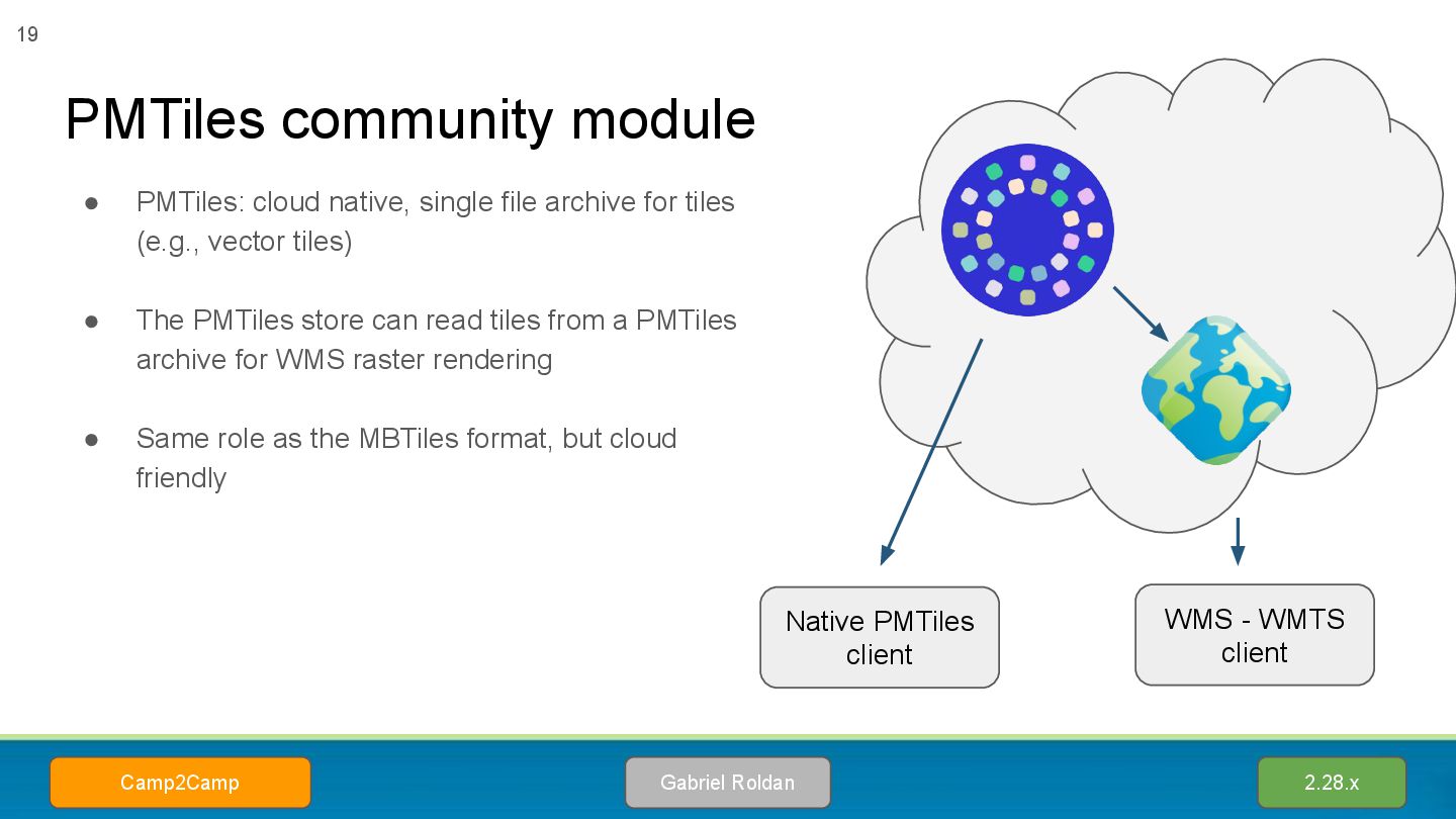 vector tiles) • The PMTiles store can read tiles from a PMTiles archive for WMS raster rendering • Same role as the MBTiles format, but cloud friendly PMTiles community module 2.28.x Gabriel Roldan Camp2Camp 19 Native PMTiles client WMS - WMTS client
