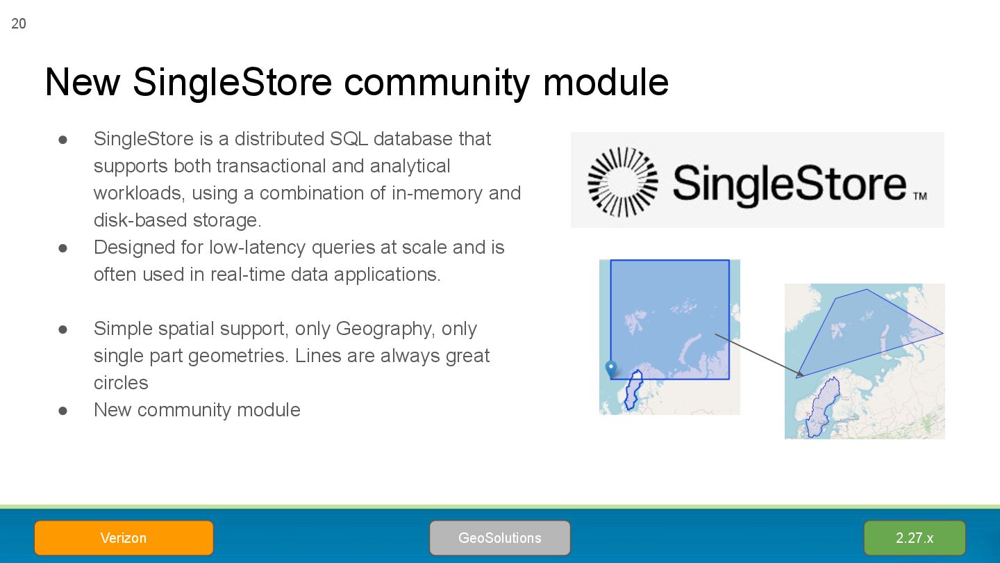 database that supports both transactional and analytical workloads, using a combination of in-memory and disk-based storage. • Designed for low-latency queries at scale and is often used in real-time data applications. • Simple spatial support, only Geography, only single part geometries. Lines are always great circles • New community module 2.27.x GeoSolutions Verizon 20