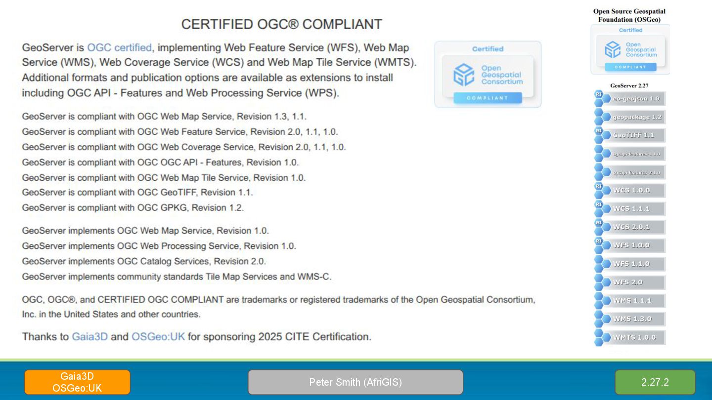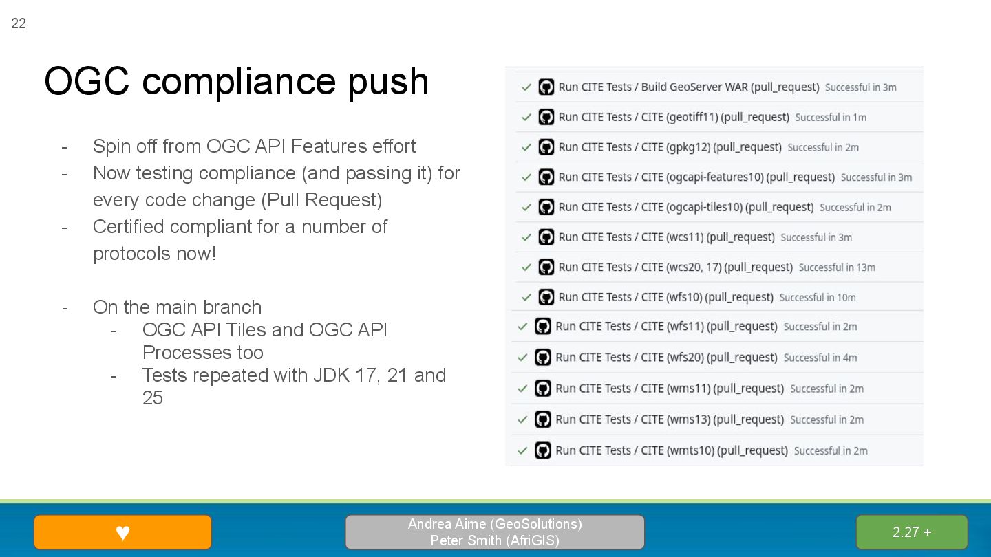 Smith (AfriGIS) 22 - Spin off from OGC API Features effort - Now testing compliance (and passing it) for every code change (Pull Request) - Certified compliant for a number of protocols now! - On the main branch - OGC API Tiles and OGC API Processes too - Tests repeated with JDK 17, 21 and 25