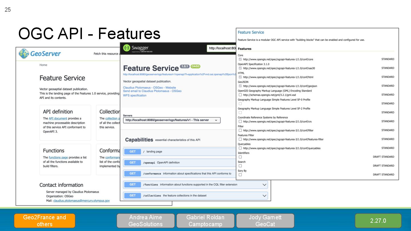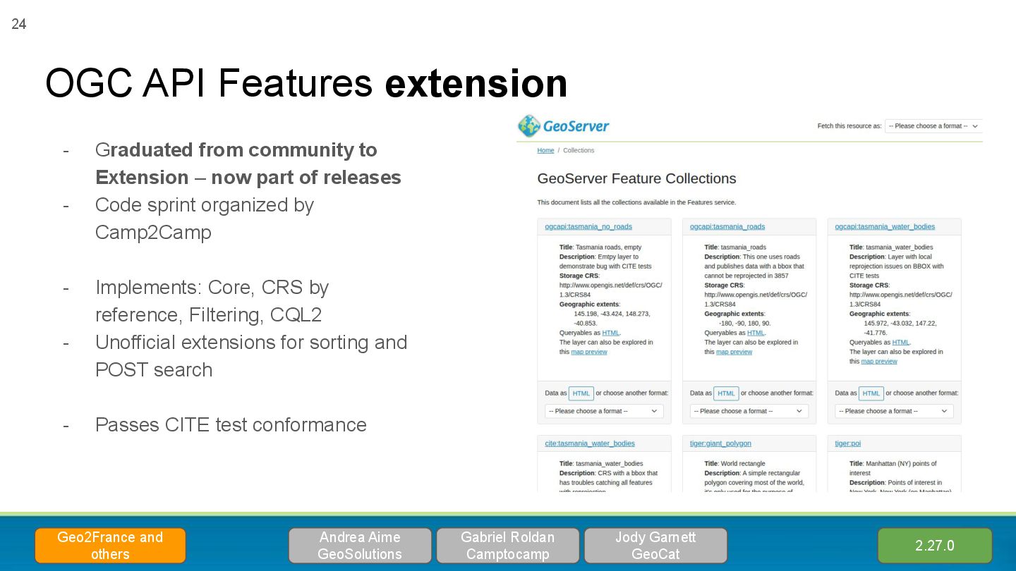 Extension – now part of releases - Code sprint organized by Camp2Camp - Implements: Core, CRS by reference, Filtering, CQL2 - Unofficial extensions for sorting and POST search - Passes CITE test conformance Gabriel Roldan Camptocamp Geo2France and others 2.27.0 Andrea Aime GeoSolutions Jody Garnett GeoCat