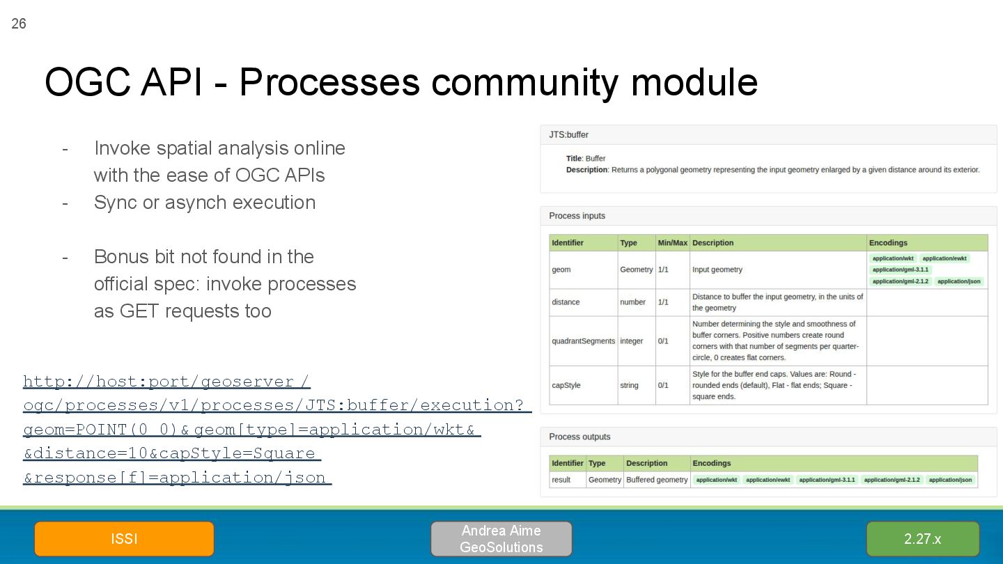 ISSI 26 - Invoke spatial analysis online with the ease of OGC APIs - Sync or asynch execution - Bonus bit not found in the official spec: invoke processes as GET requests too http://host:port/geoserver / ogc/processes/v1/processes/JTS:buffer/execution? geom=POINT(0 0)& geom[type]=application/wkt& &distance=10&capStyle=Square &response[f]=application/json