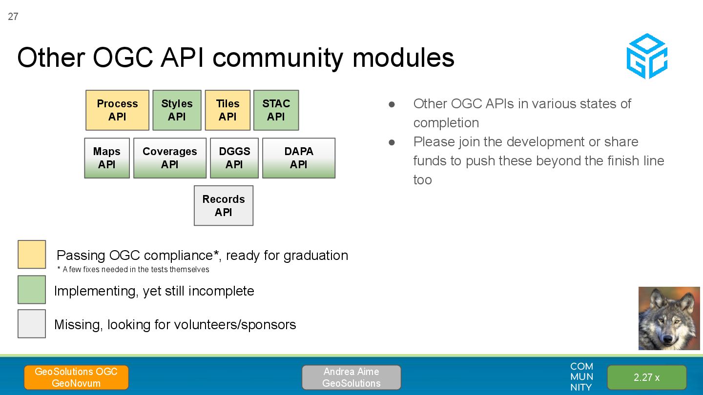 Please join the development or share funds to push these beyond the finish line too Other OGC API community modules Andrea Aime GeoSolutions GeoSolutions OGC GeoNovum Maps API Coverages API Implementing, yet still incomplete Missing, looking for volunteers/sponsors Records API Process API Tiles API Styles API STAC API 27 COM MUN NITY 2.27 x DGGS API DAPA API Passing OGC compliance*, ready for graduation * A few fixes needed in the tests themselves