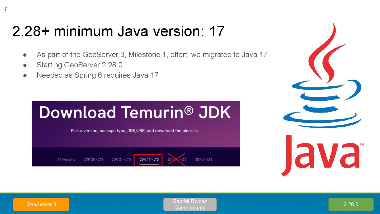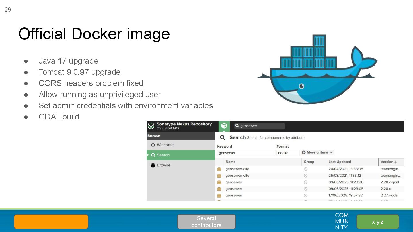 • Java 17 upgrade • Tomcat 9.0.97 upgrade • CORS headers problem fixed • Allow running as unprivileged user • Set admin credentials with environment variables • GDAL build