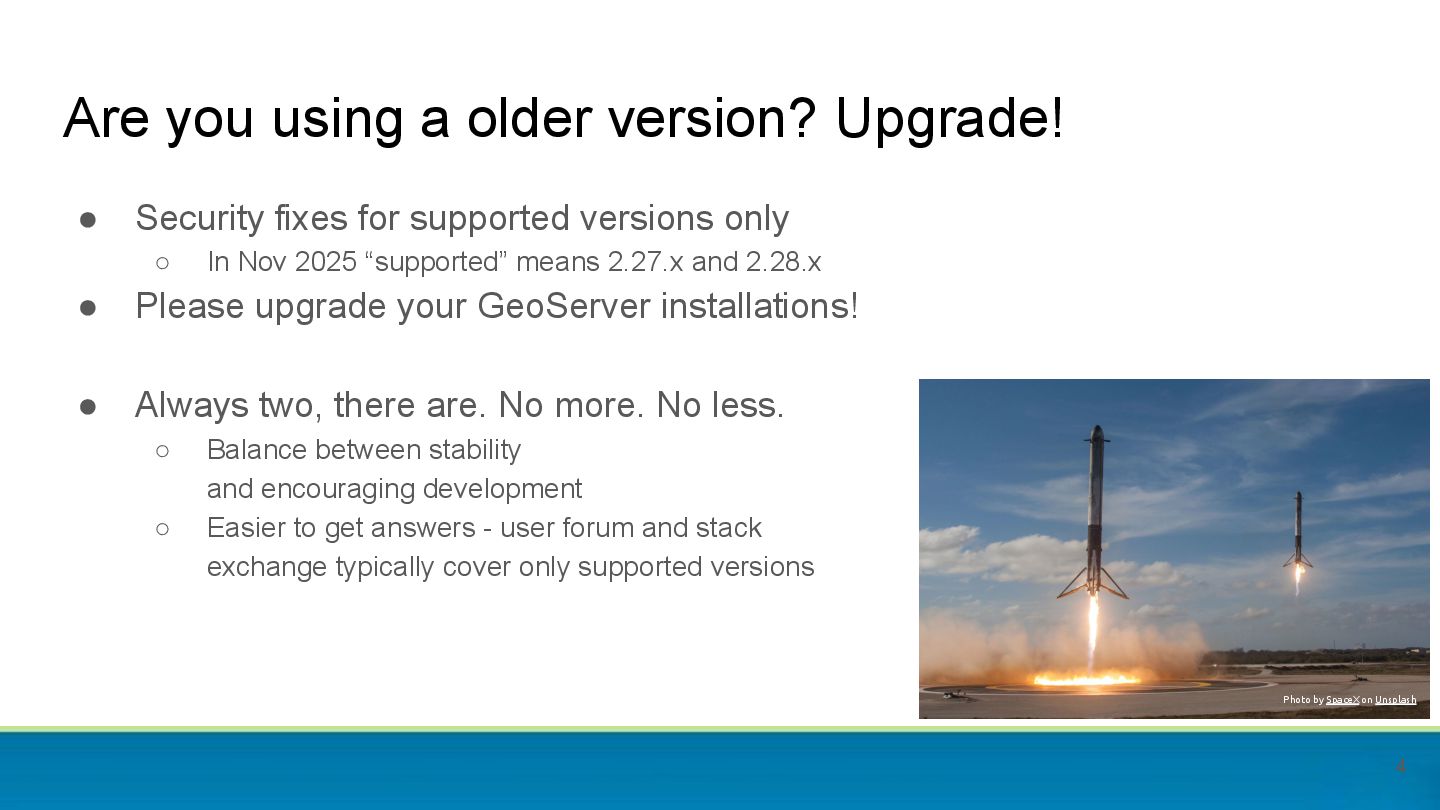 2025 “supported” means 2.27.x and 2.28.x • Please upgrade your GeoServer installations! • Always two, there are. No more. No less. ◦ Balance between stability and encouraging development ◦ Easier to get answers - user forum and stack exchange typically cover only supported versions Are you using a older version? Upgrade! Photo by SpaceX on Unsplash 4