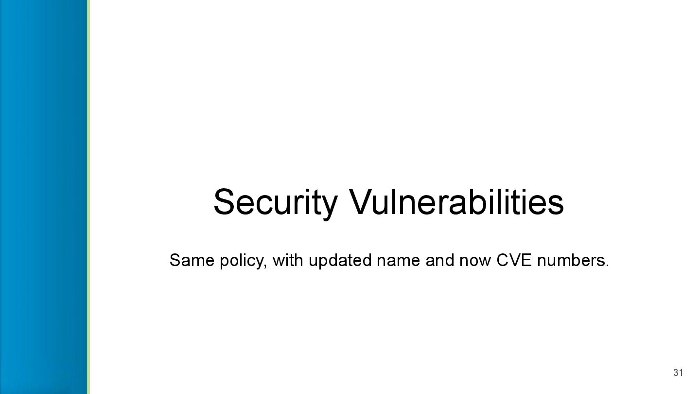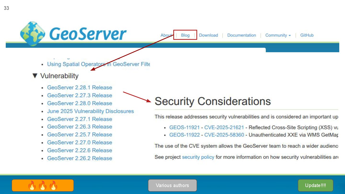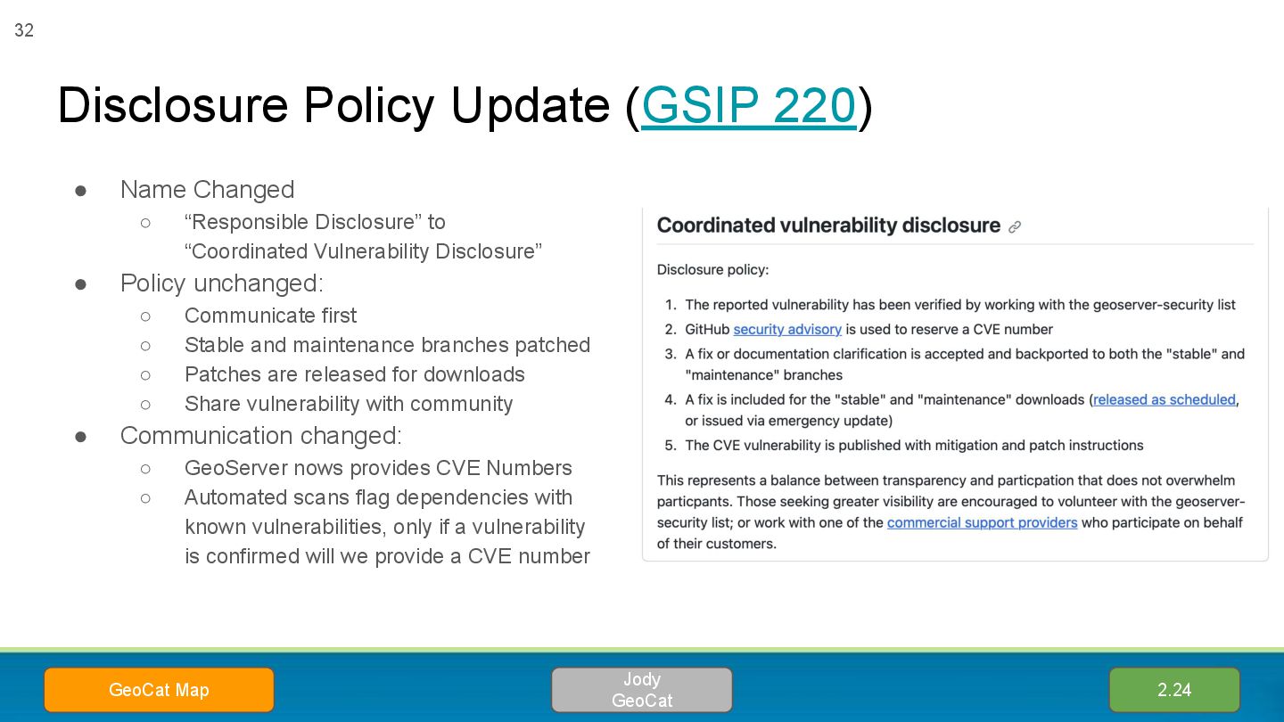 Disclosure” to “Coordinated Vulnerability Disclosure” • Policy unchanged: ◦ Communicate first ◦ Stable and maintenance branches patched ◦ Patches are released for downloads ◦ Share vulnerability with community • Communication changed: ◦ GeoServer nows provides CVE Numbers ◦ Automated scans flag dependencies with known vulnerabilities, only if a vulnerability is confirmed will we provide a CVE number 32 2.24 Jody GeoCat GeoCat Map