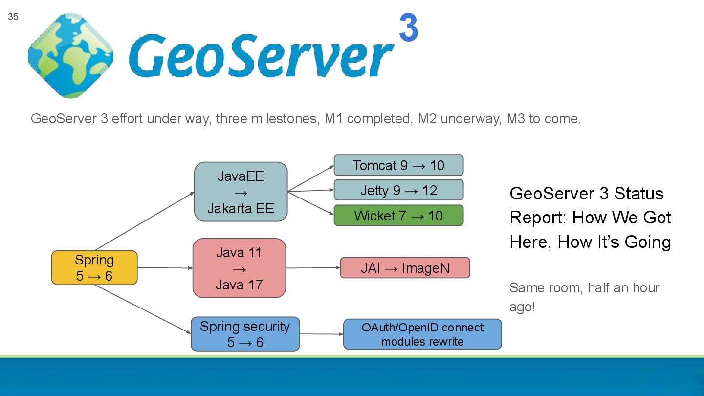 underway, M3 to come. 35 Spring 5 → 6 JavaEE → Jakarta EE Wicket 7 → 10 Tomcat 9 → 10 Spring security 5 → 6 OAuth/OpenID connect modules rewrite Java 11 → Java 17 Jetty 9 → 12 JAI → ImageN 3 GeoServer 3 Status Report: How We Got Here, How It’s Going Same room, half an hour ago!