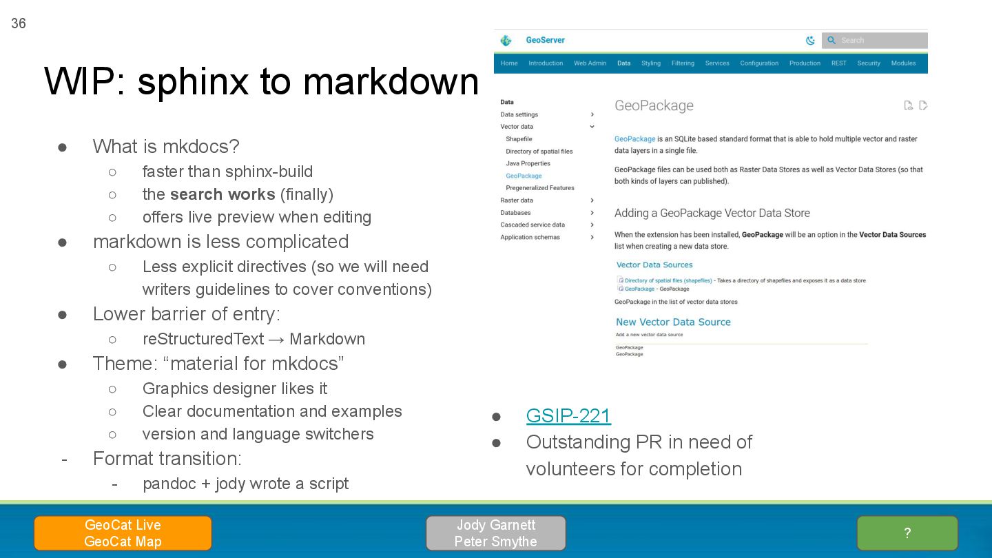 search works (finally) ◦ offers live preview when editing • markdown is less complicated ◦ Less explicit directives (so we will need writers guidelines to cover conventions) • Lower barrier of entry: ◦ reStructuredText → Markdown • Theme: “material for mkdocs” ◦ Graphics designer likes it ◦ Clear documentation and examples ◦ version and language switchers - Format transition: - pandoc + jody wrote a script WIP: sphinx to markdown ? Jody Garnett Peter Smythe GeoCat Live GeoCat Map 36 • GSIP-221 • Outstanding PR in need of volunteers for completion