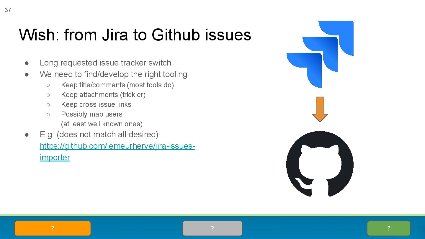 find/develop the right tooling ◦ Keep title/comments (most tools do) ◦ Keep attachments (trickier) ◦ Keep cross-issue links ◦ Possibly map users (at least well known ones) • E.g. (does not match all desired) https://github.com/lemeurherve/jira-issues- importer Wish: from Jira to Github issues ? ? ? 37