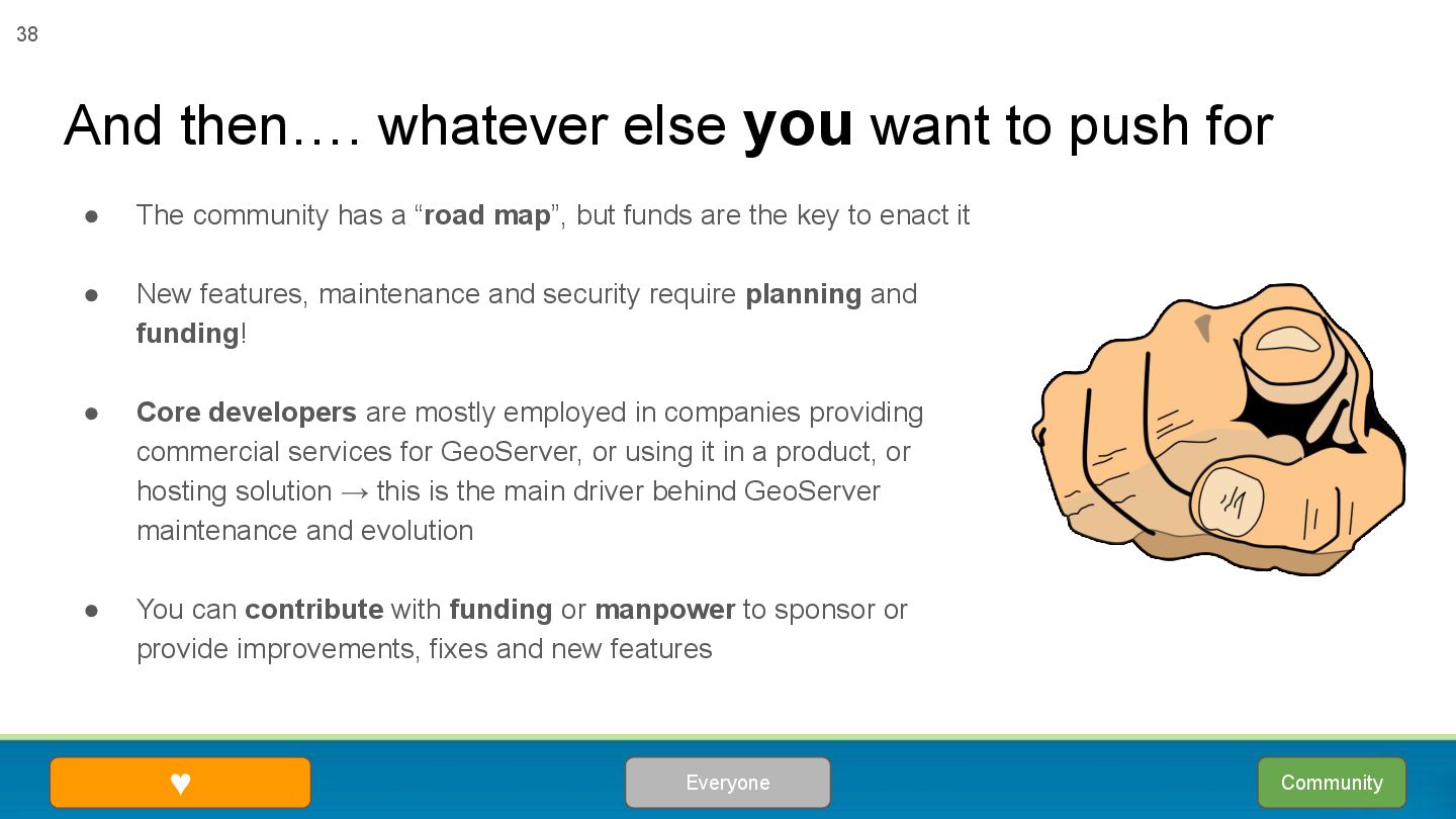the key to enact it • New features, maintenance and security require planning and funding! • Core developers are mostly employed in companies providing commercial services for GeoServer, or using it in a product, or hosting solution → this is the main driver behind GeoServer maintenance and evolution • You can contribute with funding or manpower to sponsor or provide improvements, fixes and new features And then…. whatever else you want to push for Community 38 Everyone ♥