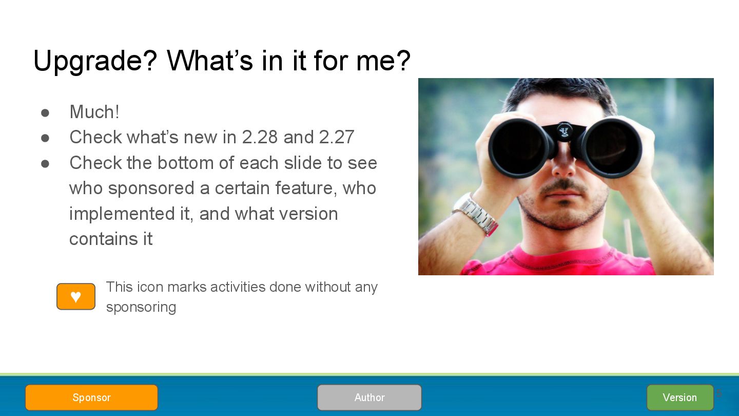 what’s new in 2.28 and 2.27 • Check the bottom of each slide to see who sponsored a certain feature, who implemented it, and what version contains it ◦ This icon marks activities done without any sponsoring Version Author Sponsor ♥ 5