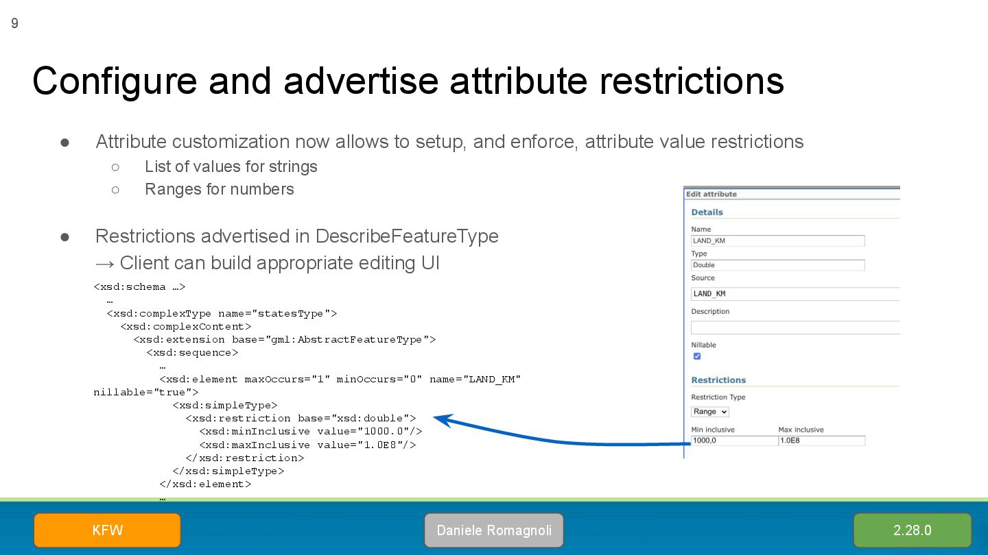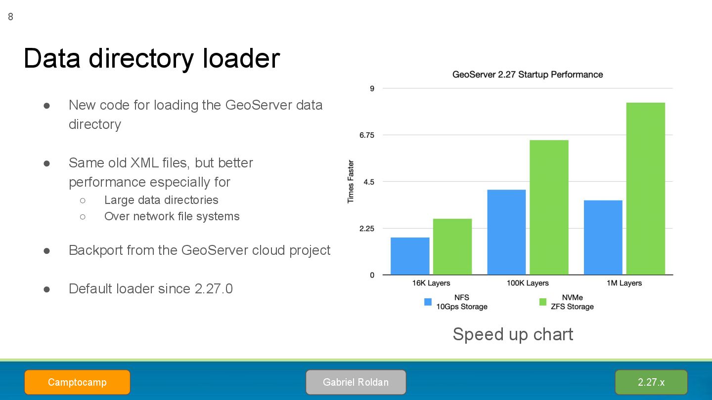 Same old XML files, but better performance especially for ◦ Large data directories ◦ Over network file systems • Backport from the GeoServer cloud project • Default loader since 2.27.0 Data directory loader Gabriel Roldan Camptocamp 2.27.x 8 Speed up chart