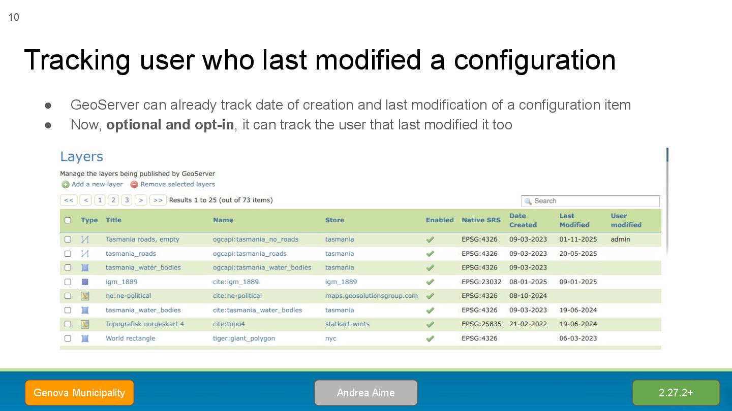 modification of a configuration item • Now, optional and opt-in, it can track the user that last modified it too Tracking user who last modified a configuration Andrea Aime Genova Municipality 2.27.2+ 10