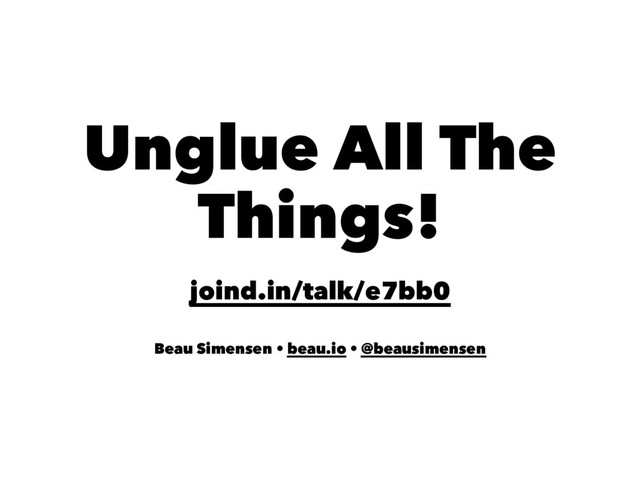 Bundles. Packages. Modules. Plugins. So much code is locked up in framework-specific packages. Integration packages are not bad, but losing the ability to reuse code that has nothing to do with a specific framework's implementation is! Don't let reusable code get locked into framework-specific glue packages! Come see practical strategies for writing framework agnostic code and walk away having a better idea how you, too, can unglue all the things!