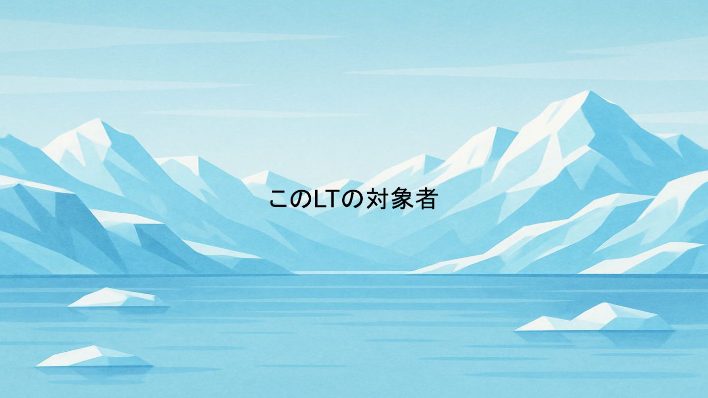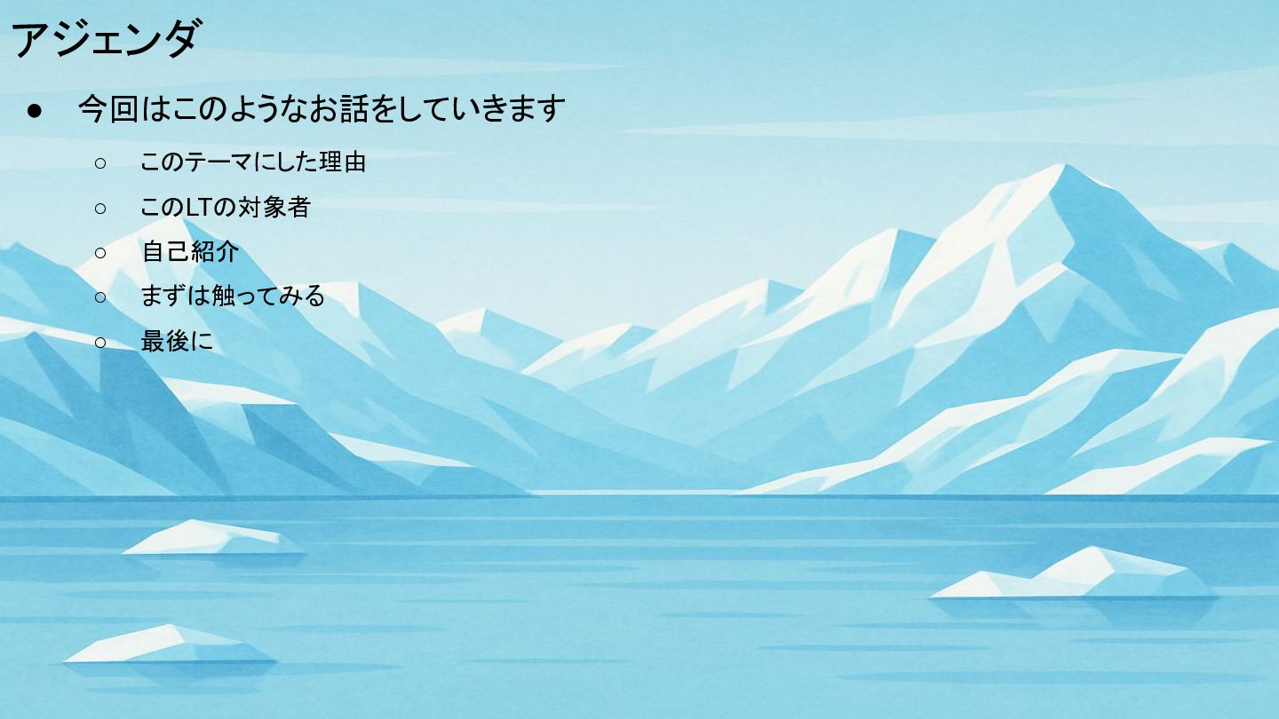 アジェンダ • 今回はこのようなお話をしていきます ◦ このテーマにした理由 ◦ このLTの対象者 ◦ 自己紹介 ◦