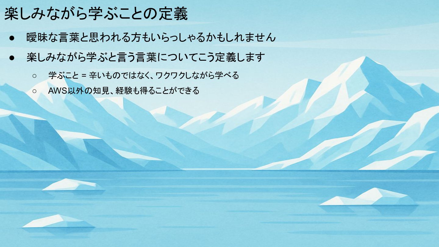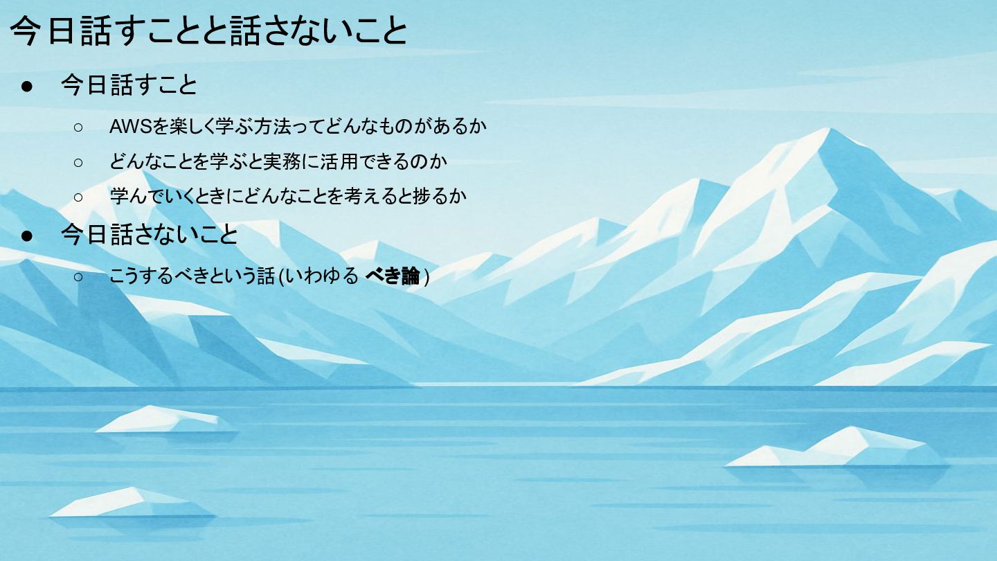 今日話すことと話さないこと • 今日話すこと ◦ AWSを楽しく学ぶ方法ってどんなものがあるか ◦ どんなことを学ぶと実務に活用できるのか ◦ 学んでいくときにどんなことを考えると捗るか •