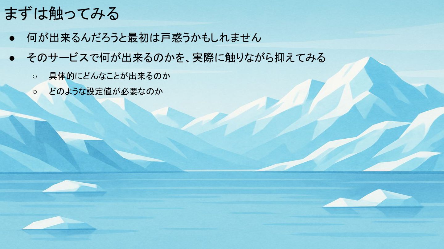 まずは触ってみる • 何が出来るんだろうと最初は戸惑うかもしれません • そのサービスで何が出来るのかを、実際に触りながら抑えてみる ◦ 具体的にどんなことが出来るのか ◦ どのような設定値が必要なのか