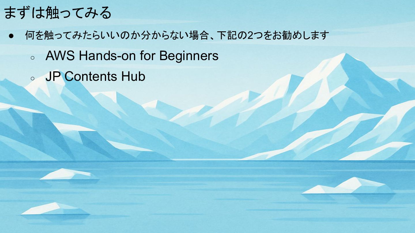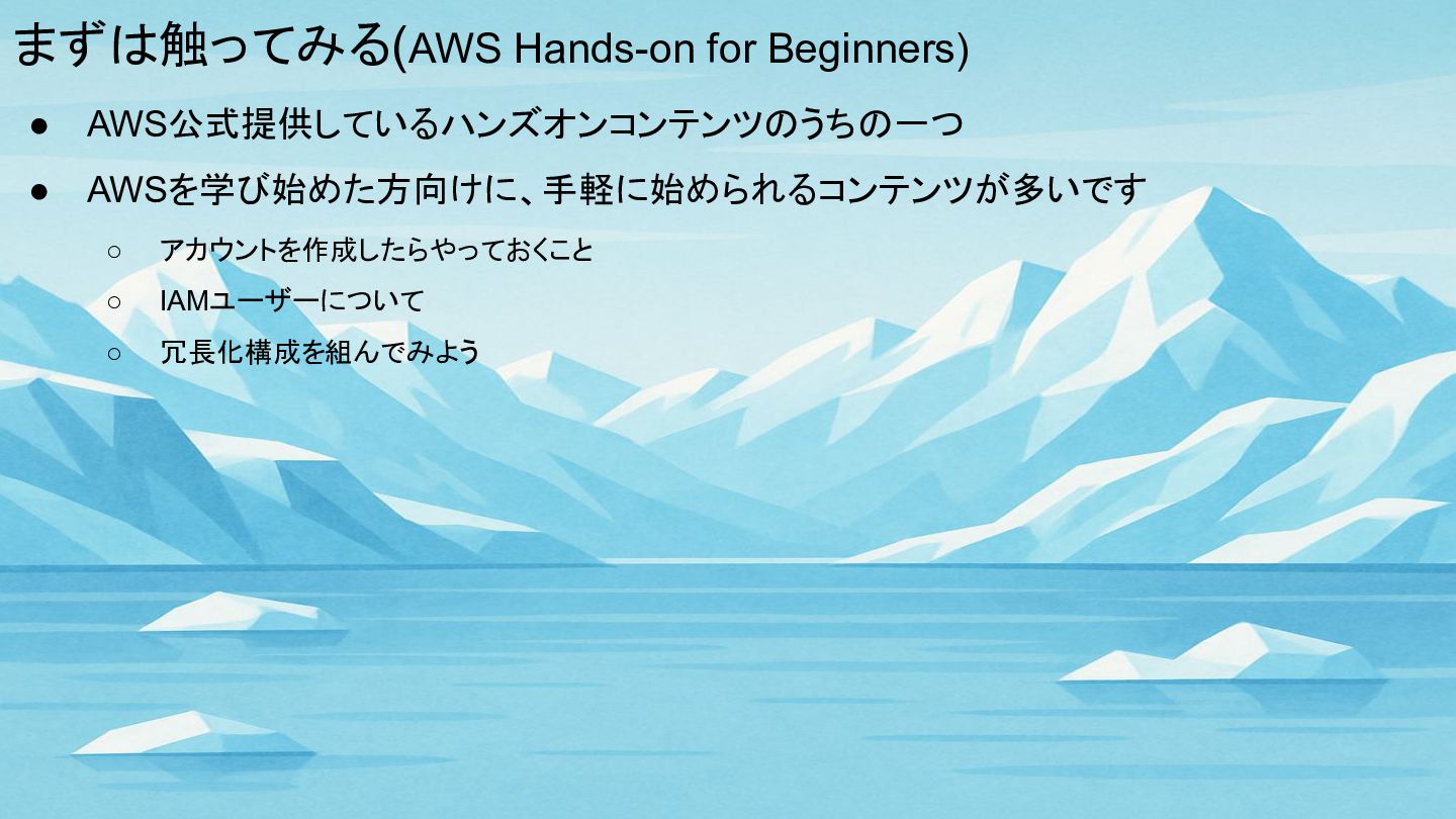 まずは触ってみる(AWS Hands-on for Beginners) • AWS公式提供しているハンズオンコンテンツのうちの一つ • AWSを学び始めた方向けに、手軽に始められるコンテンツが多いです ◦ アカウントを作成したらやっておくこと