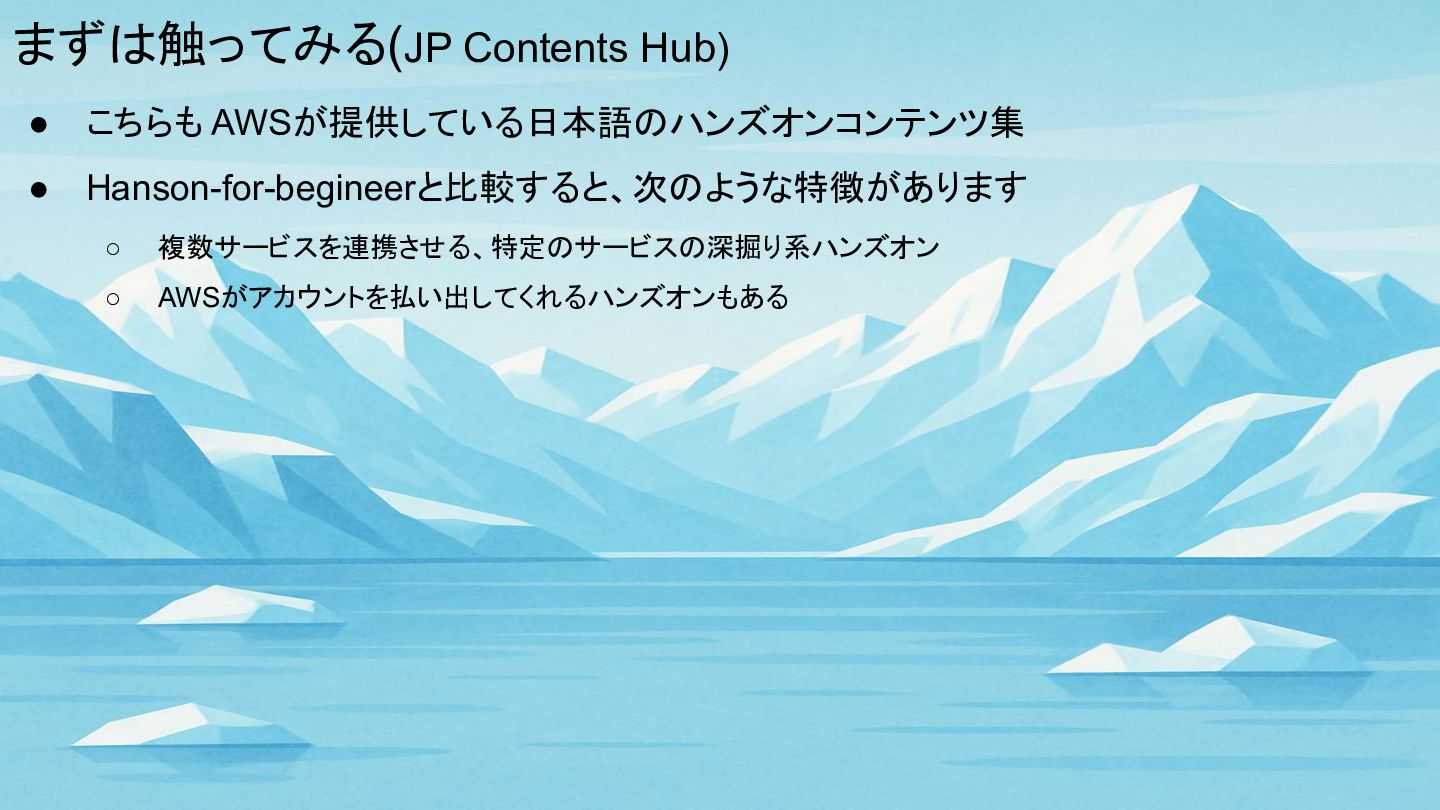まずは触ってみる(JP Contents Hub) • こちらも AWSが提供している日本語のハンズオンコンテンツ集 • Hanson-for-begineerと比較すると、次のような特徴があります ◦ 複数サービスを連携させる、特定のサービスの深掘り系ハンズオン