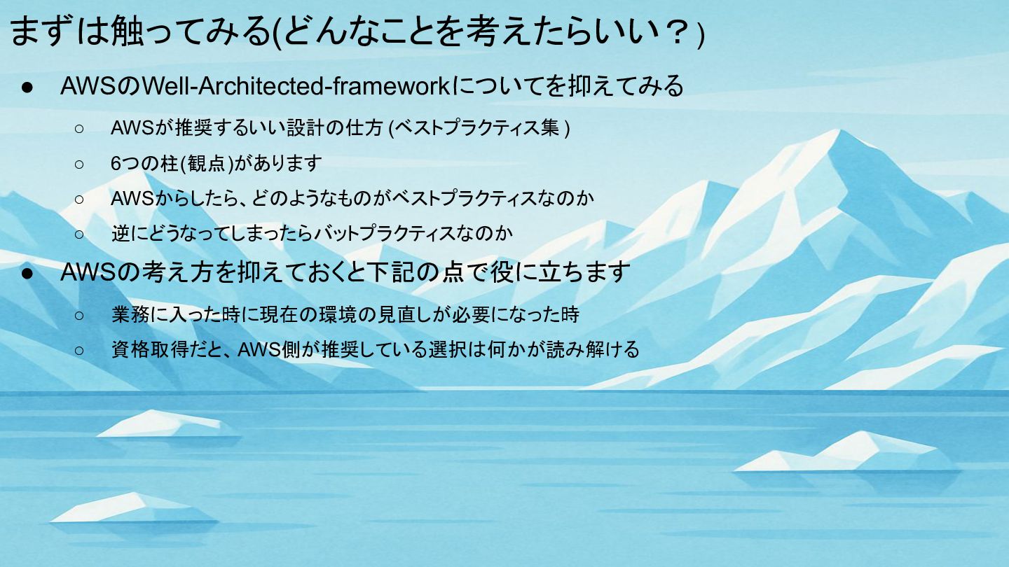 AWSからしたら、どのようなものがベストプラクティスなのか ◦ 逆にどうなってしまったらバットプラクティスなのか • AWSの考え方を抑えておくと下記の点で役に立ちます ◦ 業務に入った時に現在の環境の見直しが必要になった時 ◦ 資格取得だと、AWS側が推奨している選択は何かが読み解ける