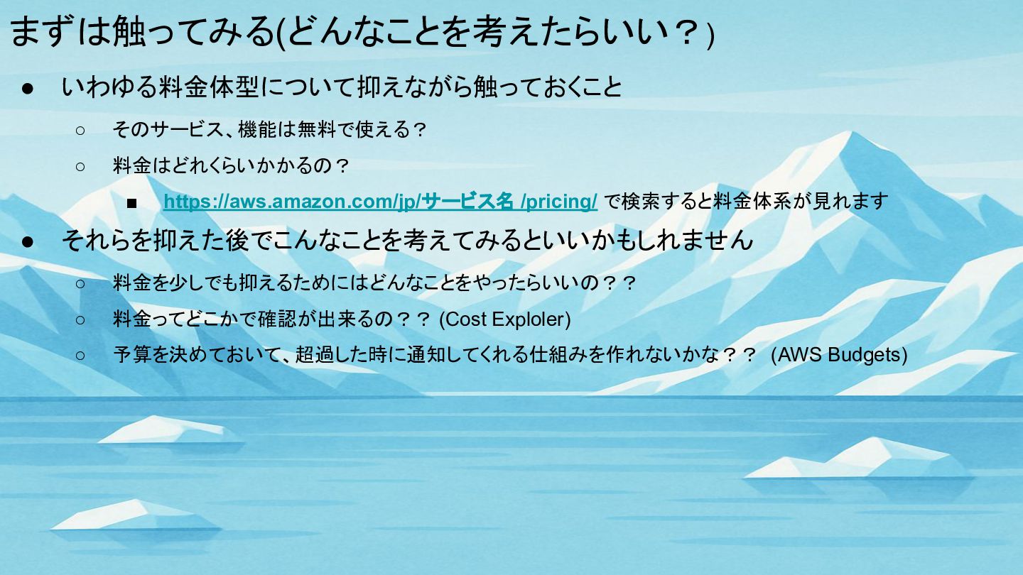 まずは触ってみる(どんなことを考えたらいい?) • いわゆる料金体型について抑えながら触っておくこと ◦ そのサービス、機能は無料で使える? ◦ 料金はどれくらいかかるの? ▪ https://aws.amazon.com/jp/サービス名 /pricing/