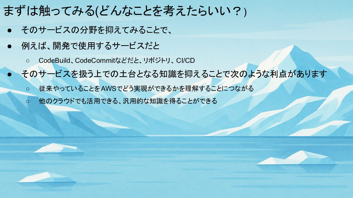 まずは触ってみる(どんなことを考えたらいい?) • そのサービスの分野を抑えてみることで、 • 例えば、開発で使用するサービスだと ◦ CodeBuild、CodeCommitなどだと、リポジトリ、 CI/CD • そのサービスを扱う上での土台となる知識を抑えることで次のような利点があります