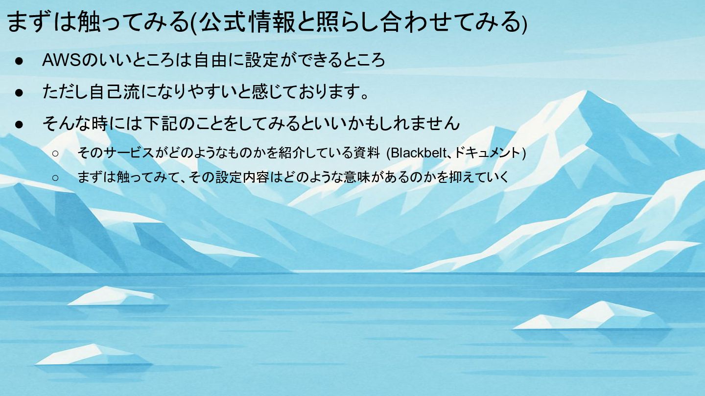 まずは触ってみる(公式情報と照らし合わせてみる) • AWSのいいところは自由に設定ができるところ • ただし自己流になりやすいと感じております。 • そんな時には下記のことをしてみるといいかもしれません ◦ そのサービスがどのようなものかを紹介している資料 (Blackbelt、ドキュメント)