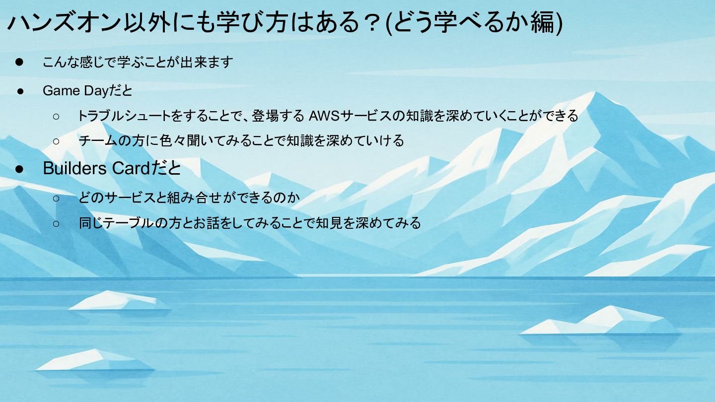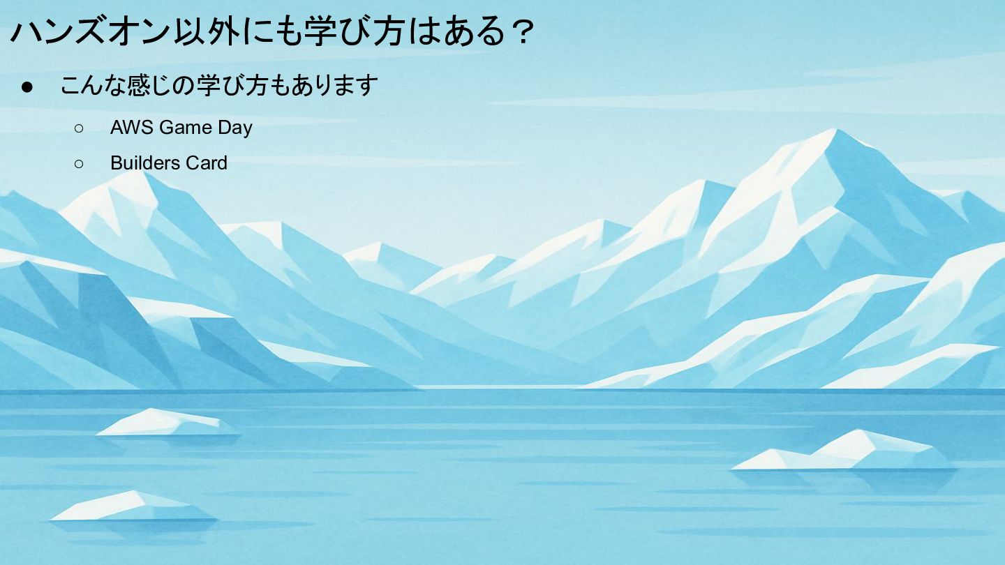 ハンズオン以外にも学び方はある? • こんな感じの学び方もあります ◦ AWS Game Day ◦ Builders Card