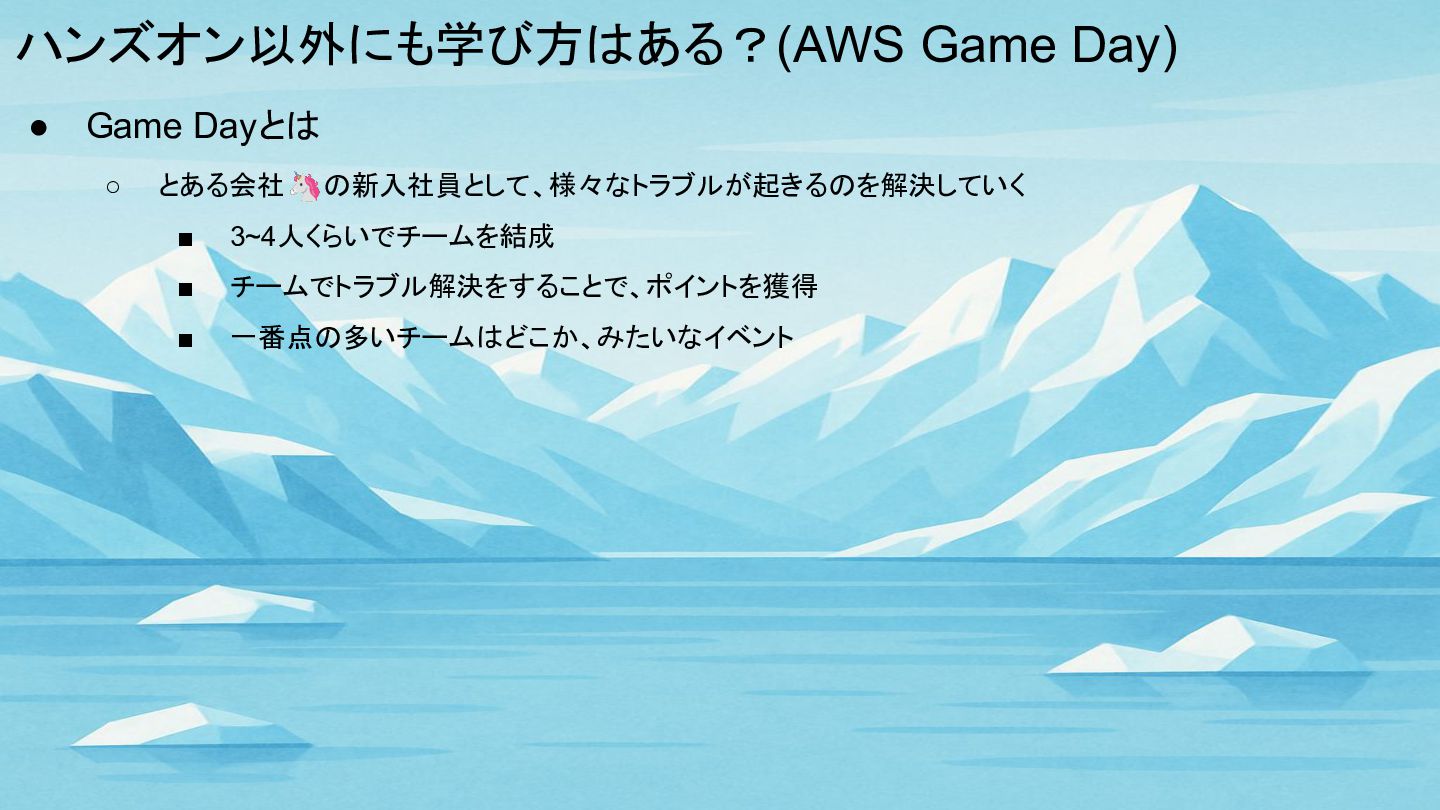 ハンズオン以外にも学び方はある?(AWS Game Day) • Game Dayとは ◦ とある会社🦄の新入社員として、様々なトラブルが起きるのを解決していく ▪ 3~4人くらいでチームを結成