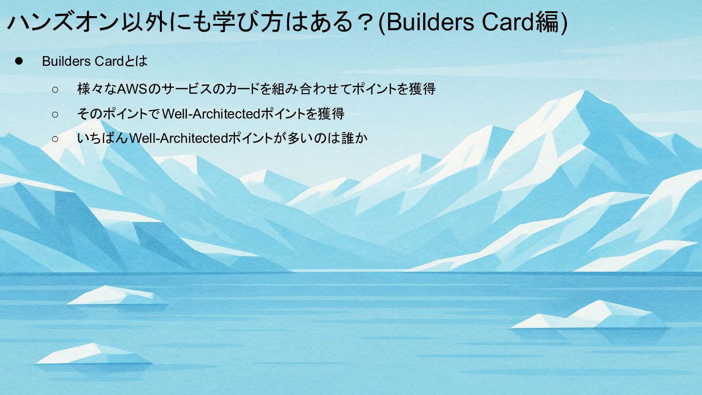 ハンズオン以外にも学び方はある?(Builders Card編) • Builders Cardとは ◦ 様々なAWSのサービスのカードを組み合わせてポイントを獲得 ◦ そのポイントでWell-Architectedポイントを獲得 ◦