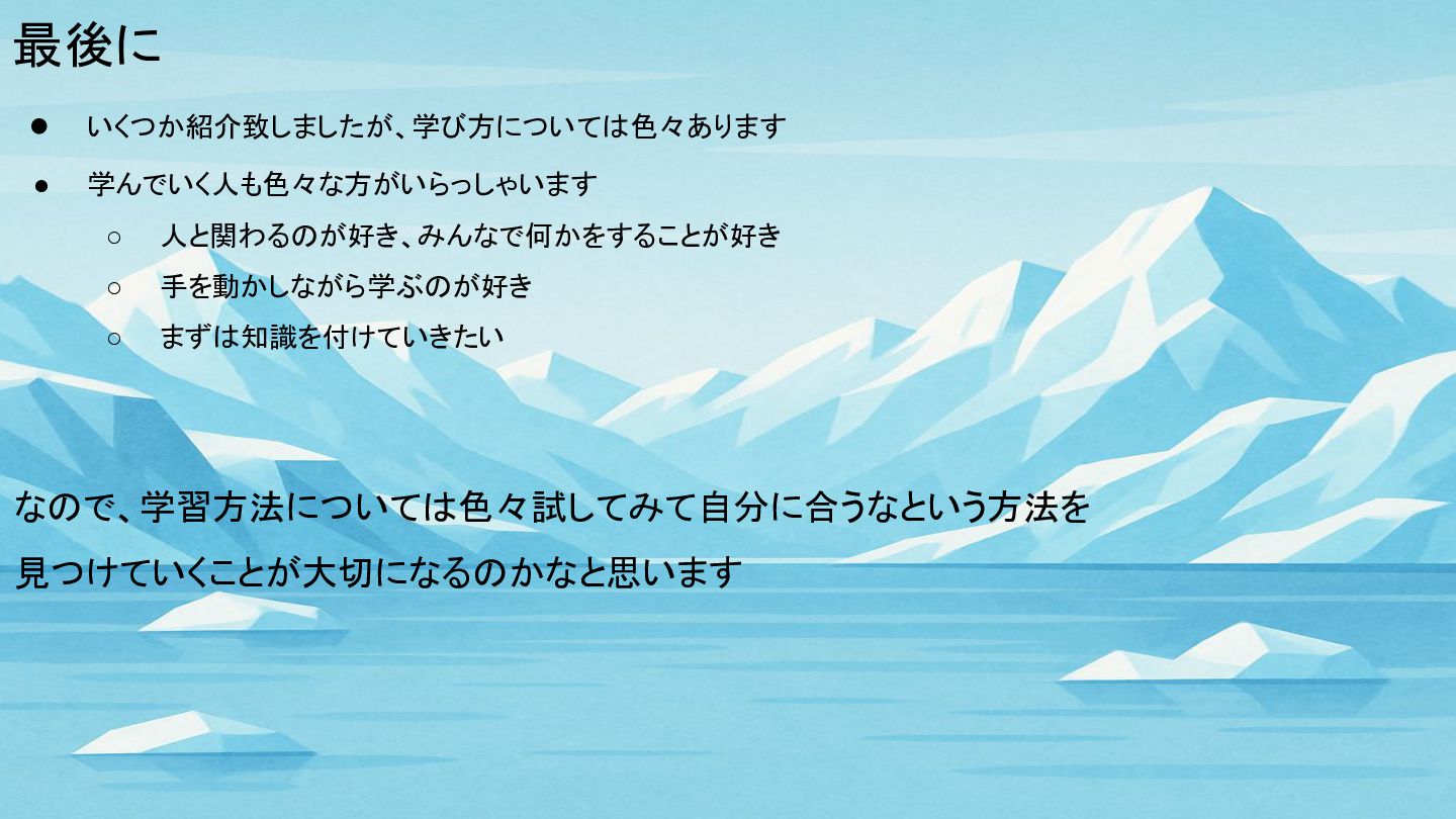 最後に • いくつか紹介致しましたが、学び方については色々あります • 学んでいく人も色々な方がいらっしゃいます ◦ 人と関わるのが好き、みんなで何かをすることが好き ◦ 手を動かしながら学ぶのが好き ◦