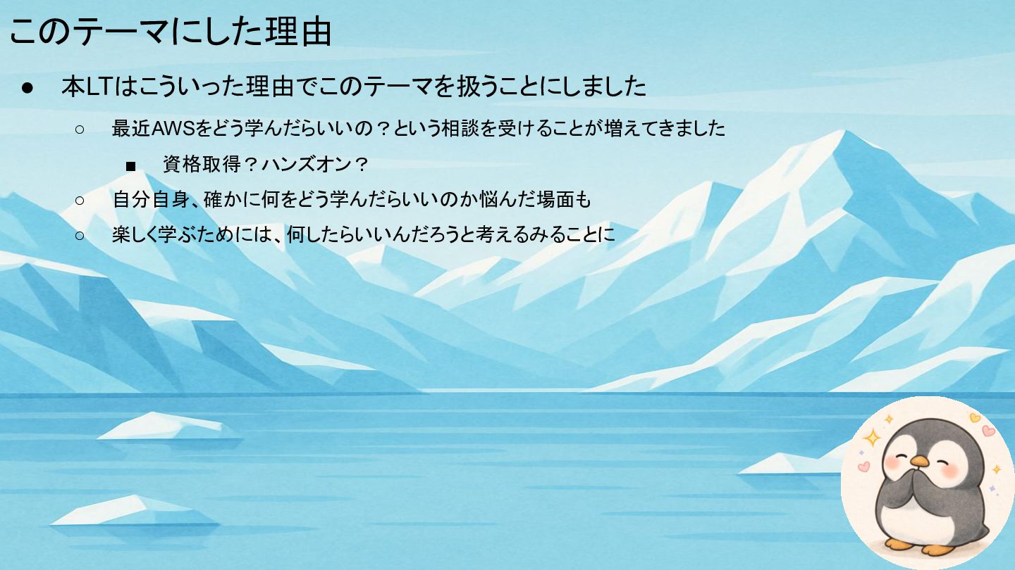 このテーマにした理由 • 本LTはこういった理由でこのテーマを扱うことにしました ◦ 最近AWSをどう学んだらいいの?という相談を受けることが増えてきました ▪ 資格取得?ハンズオン? ◦ 自分自身、確かに何をどう学んだらいいのか悩んだ場面も ◦