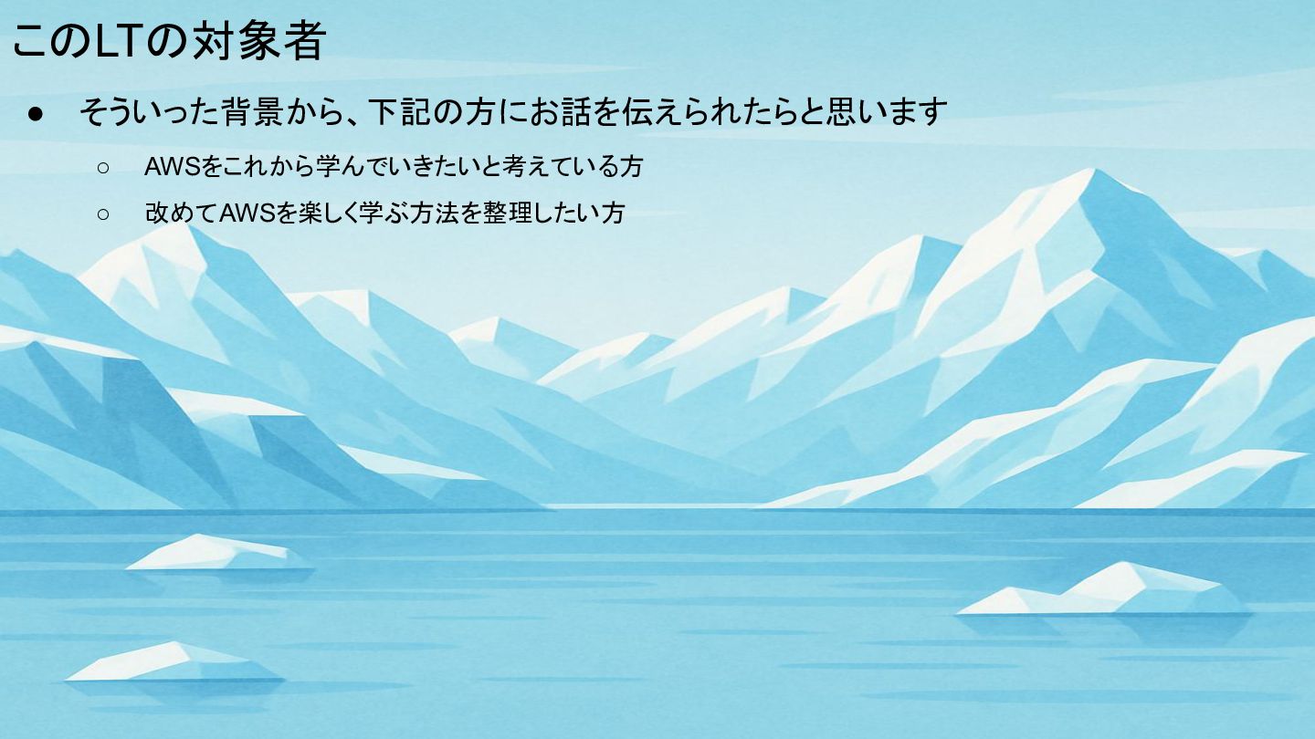 このLTの対象者 • そういった背景から、下記の方にお話を伝えられたらと思います ◦ AWSをこれから学んでいきたいと考えている方 ◦ 改めてAWSを楽しく学ぶ方法を整理したい方