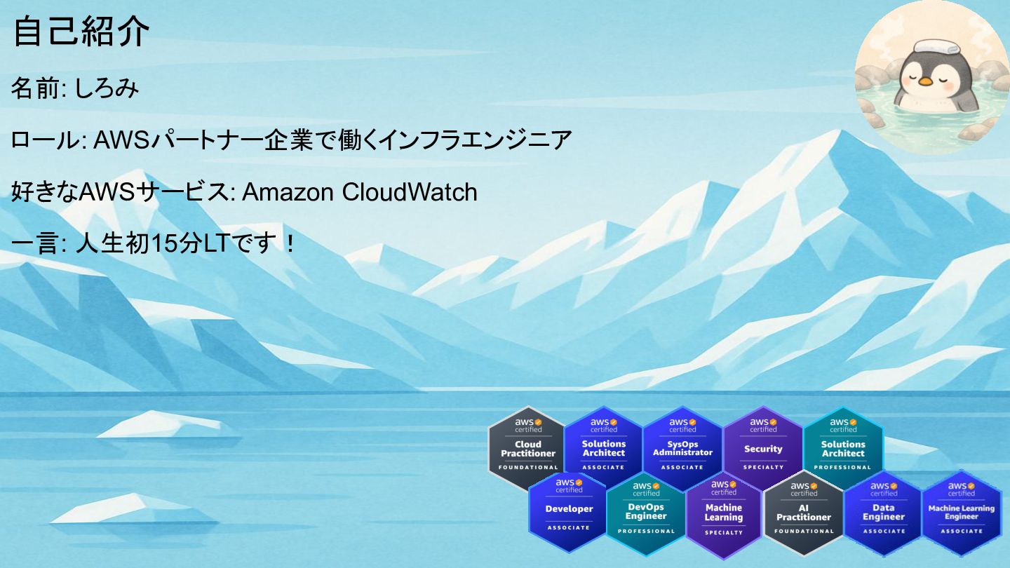 自己紹介 名前: しろみ ロール: AWSパートナー企業で働くインフラエンジニア 好きなAWSサービス: Amazon CloudWatch 一言: 人生初15分LTです!