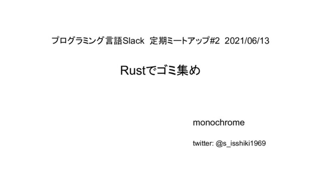 プログラミング言語Slack 定期ミートアップ#2 2021/06/13 Rustでゴミ集め monochrome twitter: @s_isshiki1969