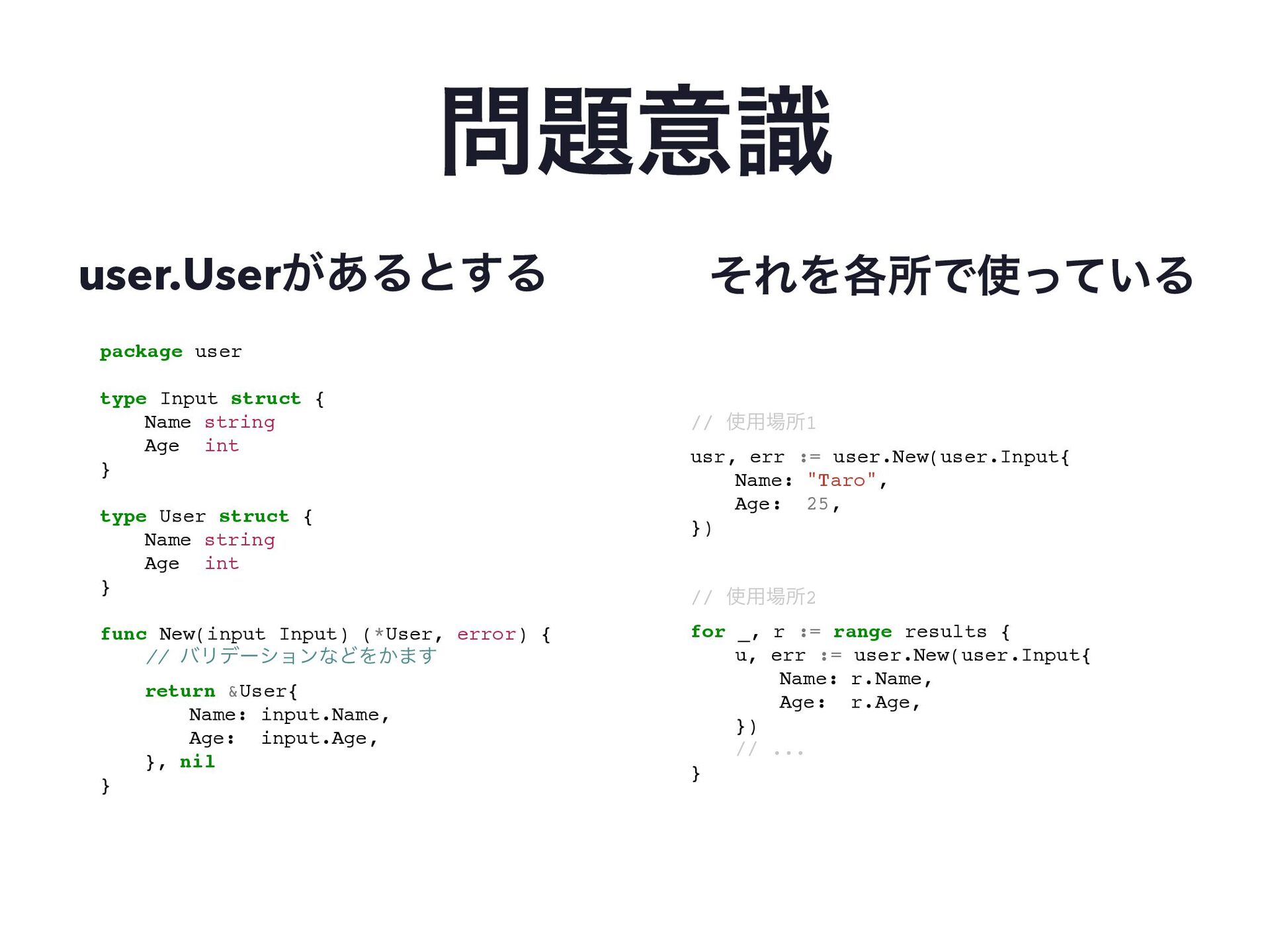 int } type User struct { Name string Age int } func New(input Input) (*User, error) { // όϦσʔγϣϯͳͲΛ͔·͢ return &User{ Name: input.Name, Age: input.Age, }, nil } user.User͕͋Δͱ͢Δ ͦΕΛ֤ॴͰ͍ͬͯΔ // ༻ॴ1 usr, err := user.New(user.Input{ Name: "Taro", Age: 25, }) // ༻ॴ2 for _, r := range results { u, err := user.New(user.Input{ Name: r.Name, Age: r.Age, }) // ... }