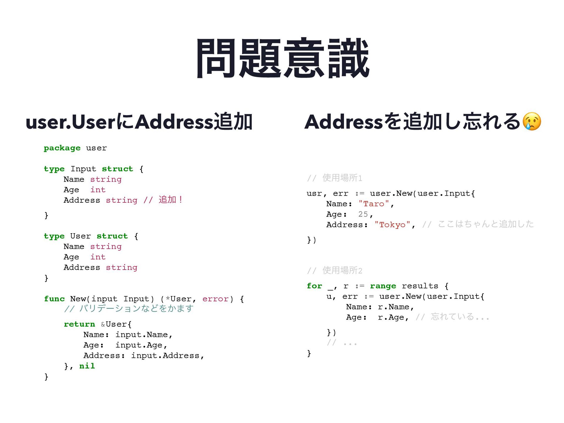 int Address string // Ճʂ } type User struct { Name string Age int Address string } func New(input Input) (*User, error) { // όϦσʔγϣϯͳͲΛ͔·͢ return &User{ Name: input.Name, Age: input.Age, Address: input.Address, }, nil } user.UserʹAddressՃ AddressΛՃ͠ΕΔ😢 // ༻ॴ1 usr, err := user.New(user.Input{ Name: "Taro", Age: 25, Address: "Tokyo", // ͪ͜͜ΌΜͱՃͨ͠ }) // ༻ॴ2 for _, r := range results { u, err := user.New(user.Input{ Name: r.Name, Age: r.Age, // Ε͍ͯΔ... }) // ... }