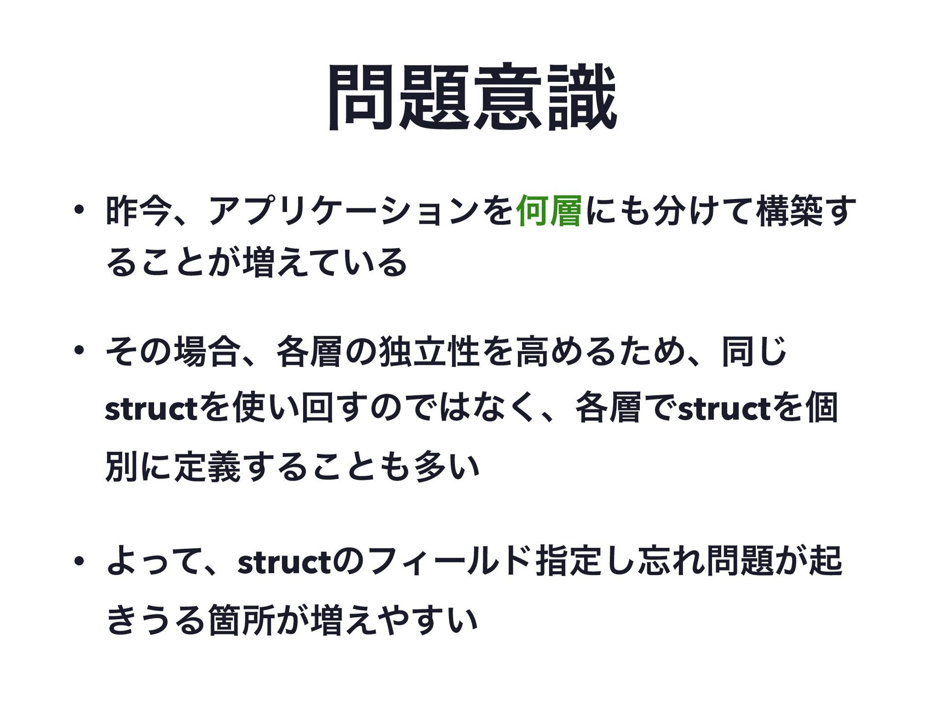 ҙࣝ • ࡢࠓɺΞϓϦέʔγϣϯΛԿʹ͚ͯߏங͢ Δ͜ͱ͕૿͍͑ͯΔ • ͦͷ߹ɺ֤ͷಠཱੑΛߴΊΔͨΊɺಉ͡ structΛ͍ճ͢ͷͰͳ͘ɺ֤ͰstructΛݸ ผʹఆٛ͢Δ͜ͱଟ͍ • ΑͬͯɺstructͷϑΟʔϧυࢦఆ͠Ε͕ى