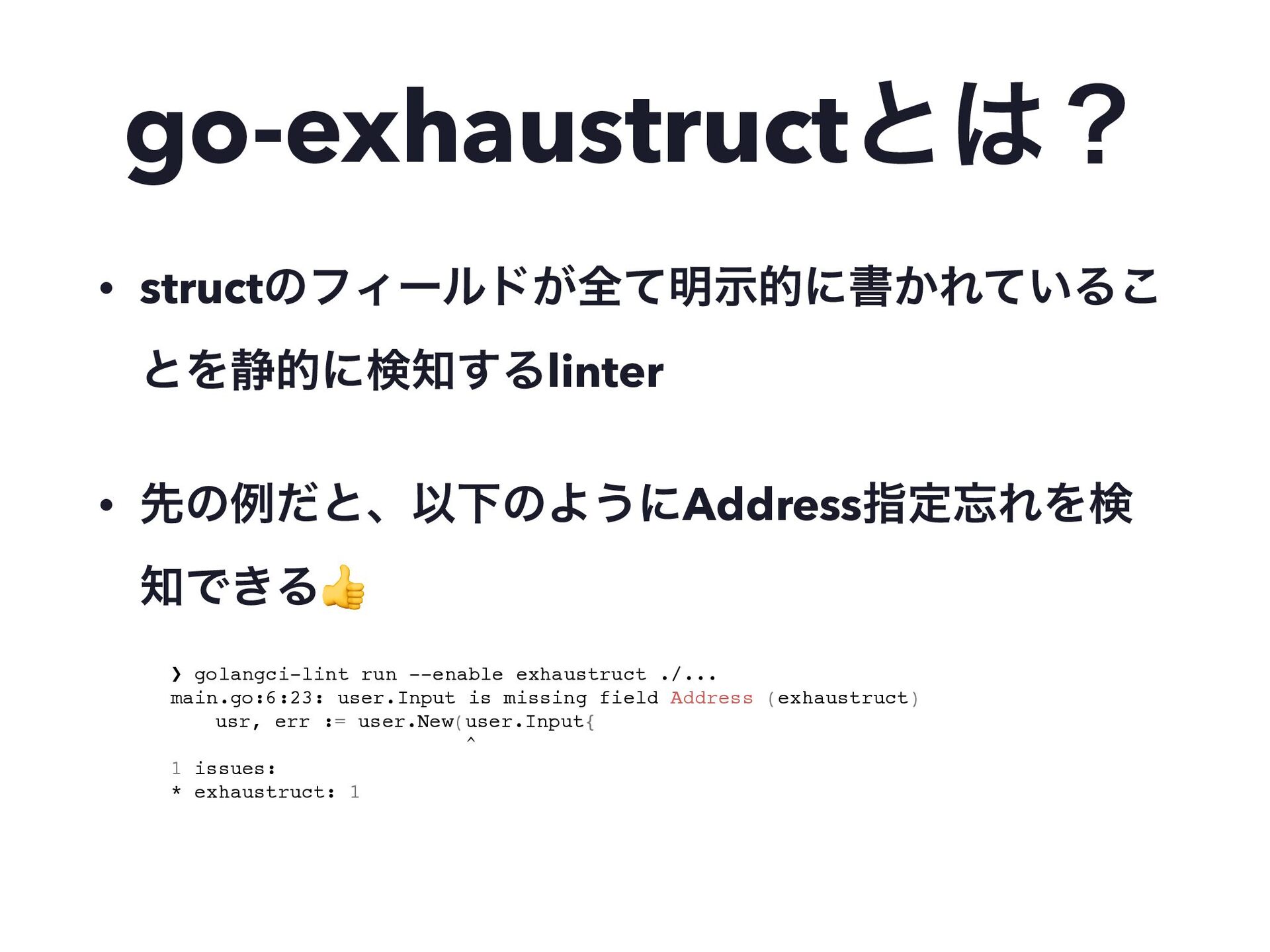 go-exhaustructͱʁ • structͷϑΟʔϧυ͕શͯ໌ࣔతʹॻ͔Ε͍ͯΔ͜ ͱΛ੩తʹݕ͢Δlinter • ઌͷྫͩͱɺҎԼͷΑ͏ʹAddressࢦఆΕΛݕ Ͱ͖Δ👍 • ❯ golangci-lint