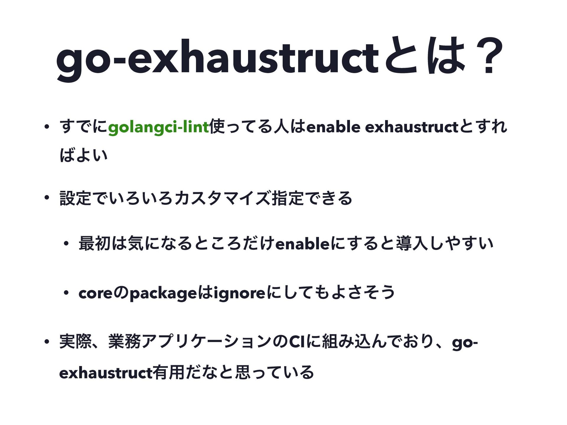 go-exhaustructͱʁ • ͢Ͱʹgolangci-lintͬͯΔਓenable exhaustructͱ͢Ε Α͍ • ઃఆͰ͍Ζ͍ΖΧελϚΠζࢦఆͰ͖Δ • ࠷ॳؾʹͳΔͱ͜Ζ͚ͩenableʹ͢Δͱಋೖ͍͢͠ •