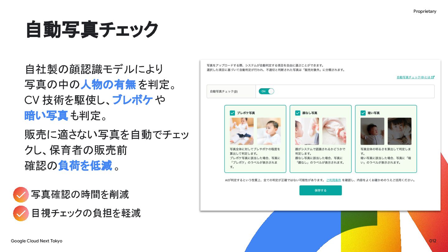 Proprietary 012 Google Cloud Next Tokyo 自動写真チェック 自社製の顔認識モデルにより 写真の中の人物の有無 を判定。