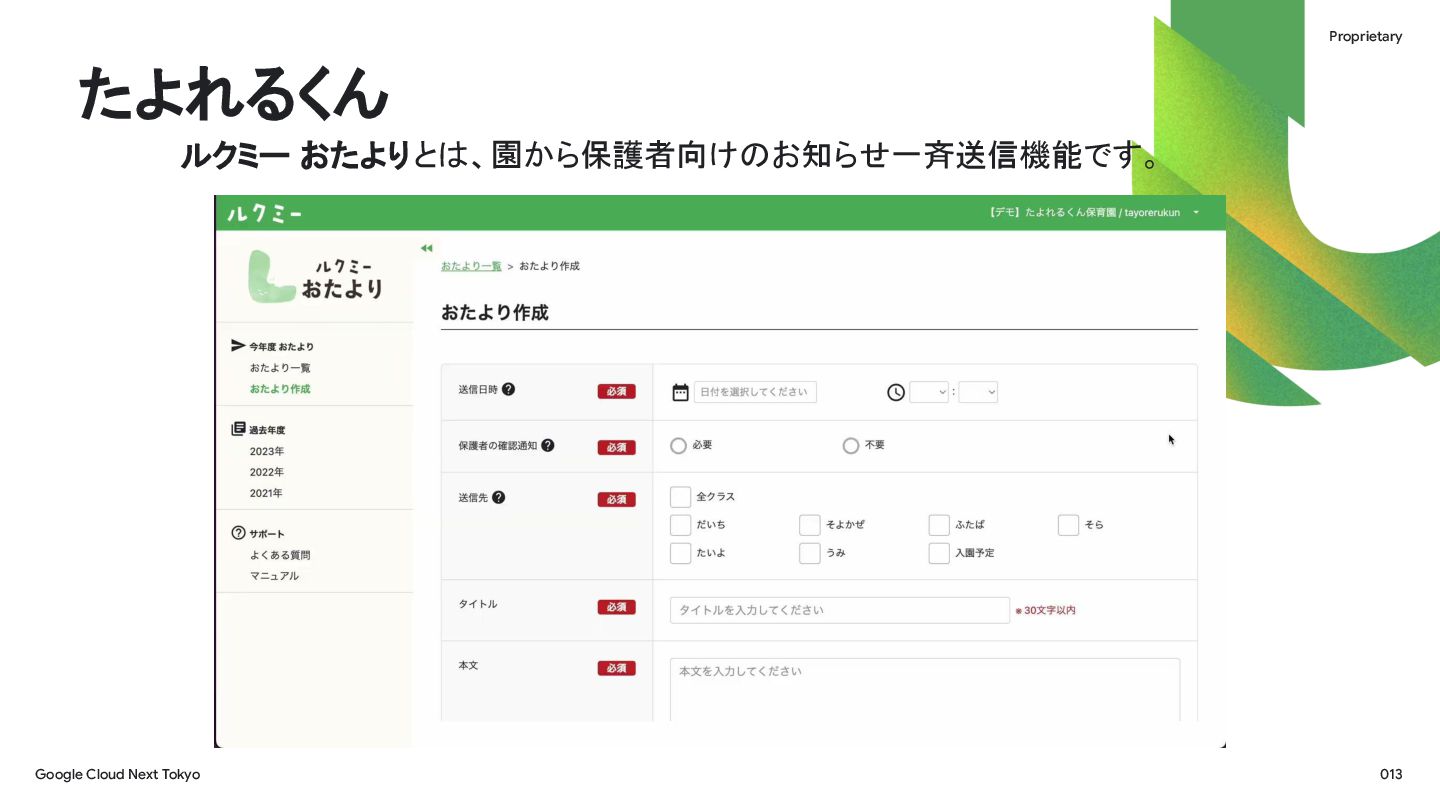 Proprietary 013 Google Cloud Next Tokyo たよれるくん ルクミー おたよりとは、園から保護者向けのお知らせ一斉送信機能です。